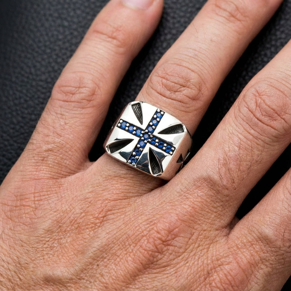 احمل رمزاً خالداً للشجاعة والشرف والحماية مع هذا خاتم الصليب المالطي اللافت. صُنع بإتقان من الفضة الإسترلينية .925 الصلبة ومزين بأحجار زرقاء عميقة، هذا الخاتم هو تحية عصرية لرمز الفروسية القديم. إنه قطعة مميزة للرجل العصري، وراكب الدراجات، وكل من يعيش بقوة ونزاهة.