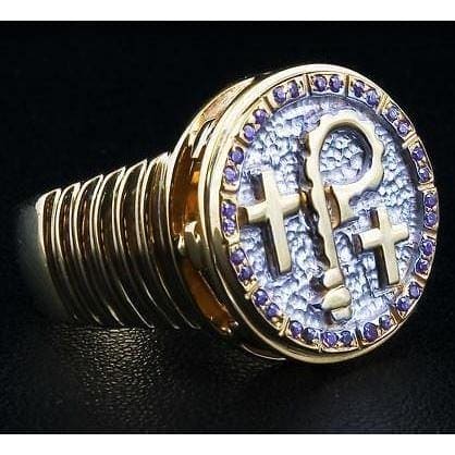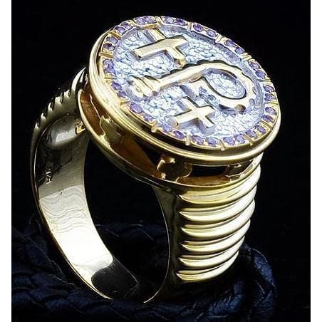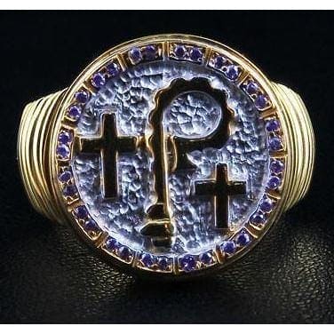 س: ما الذي يجعل هذا واحداً من أكثر خواتم الرجال المسيحية تميزاً لديكم؟ ج: إلى جانب رمز العصا النادر، فإن مزيج الخلفية الفضية المزخرفة، ولمسات الذهب اللامعة، والهالة الأرجوانية من الجمشت، والحزام المخطط، يخلق قطعة معقدة وملفتة للنظر لا مثيل لها.