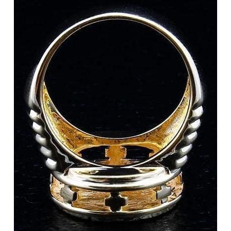 وجه الخاتم يروي قصة قوية. في مركزه يوجد عصا الأسقف، المعروفة أيضًا باسم عصا الراعي أو العصا الرعوية. هذا الرمز القديم، المصمم على شكل عصا الراعي، يرمز إلى الإرشاد والحماية والقيادة الروحية. يحيط به صليبان مسيحيان، مما يعزز رسالة الإيمان الراسخ. وقد تم إبراز هذه الرموز القوية بالذهب المصقول، وتوضع على خلفية فضية خشنة وفريدة، مما يخلق تباينًا بصريًا رائعًا.