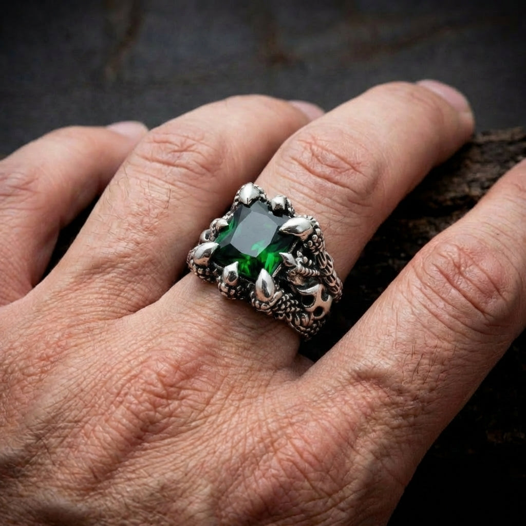 خاتم مخلب التنين الأخضر القوطي من الفضة الإسترلينية