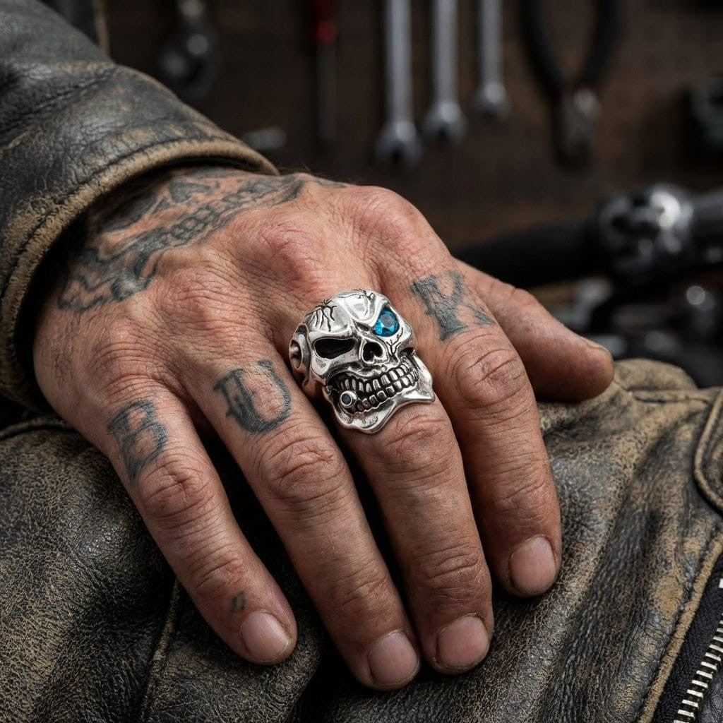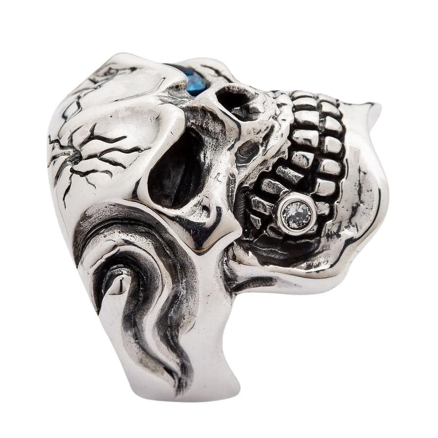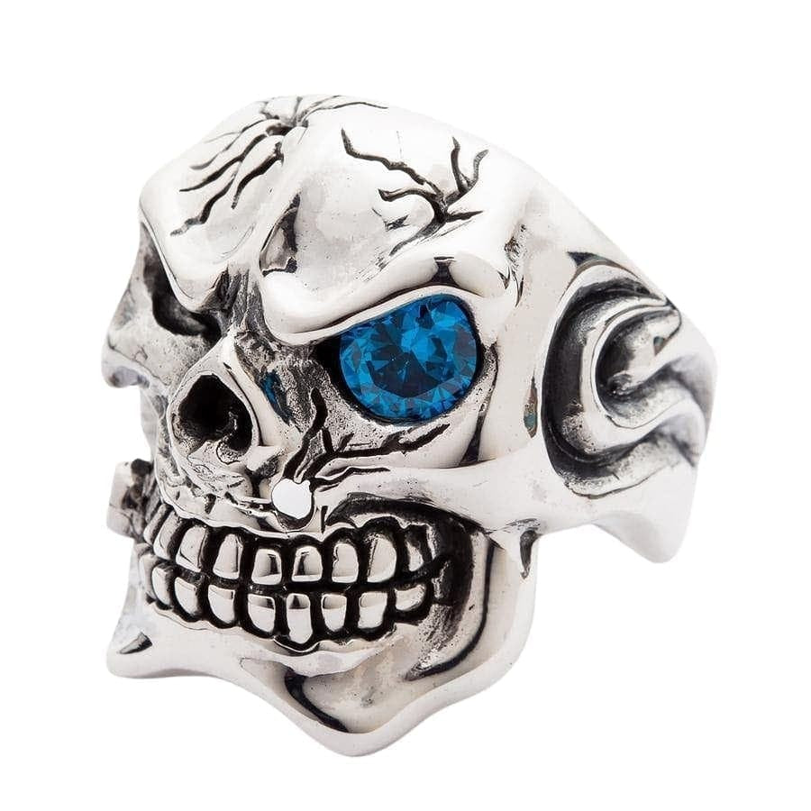 خاتم جمجمة المافيا مع عين توباز أزرق – مجوهرات فضية جريئة بأسلوب قوطي