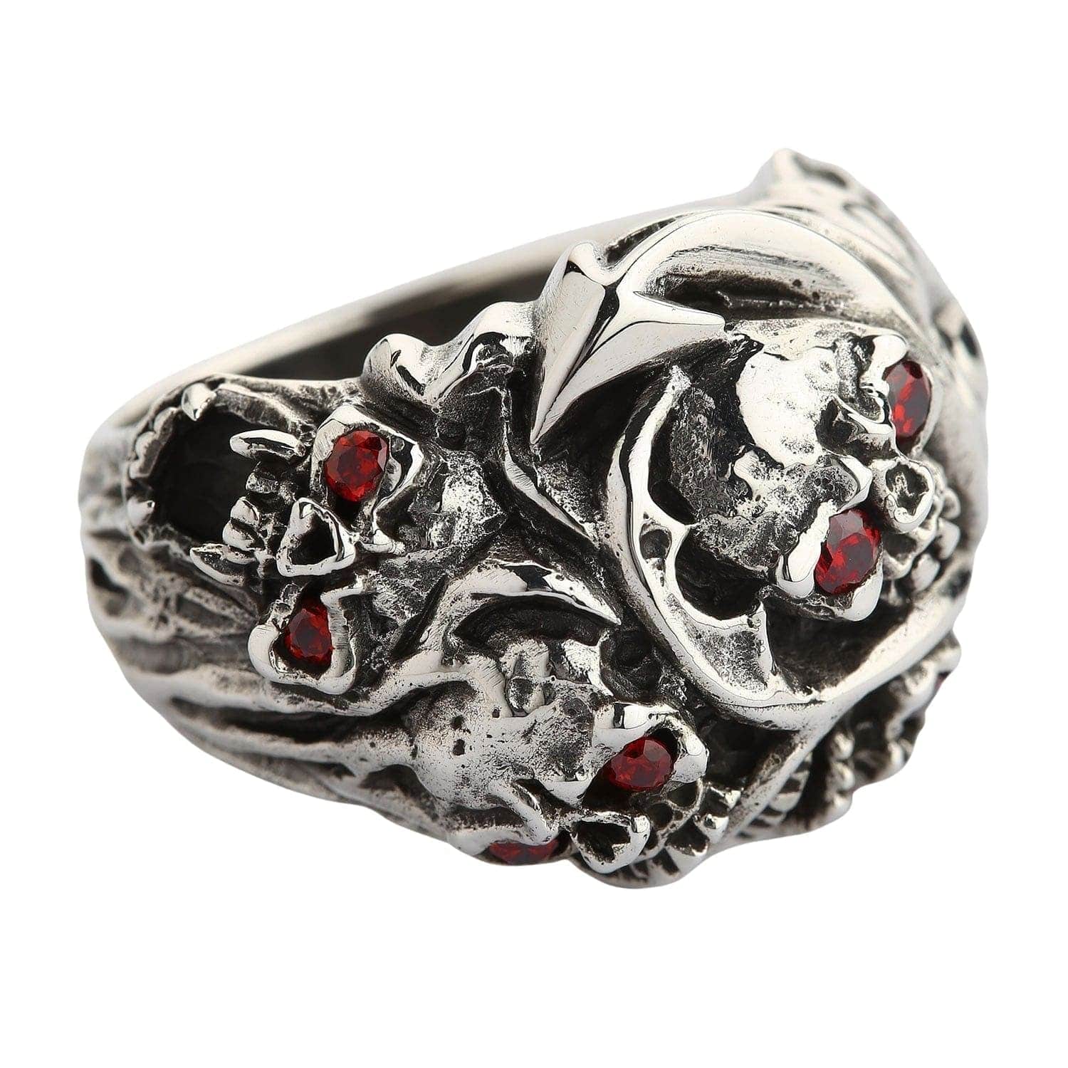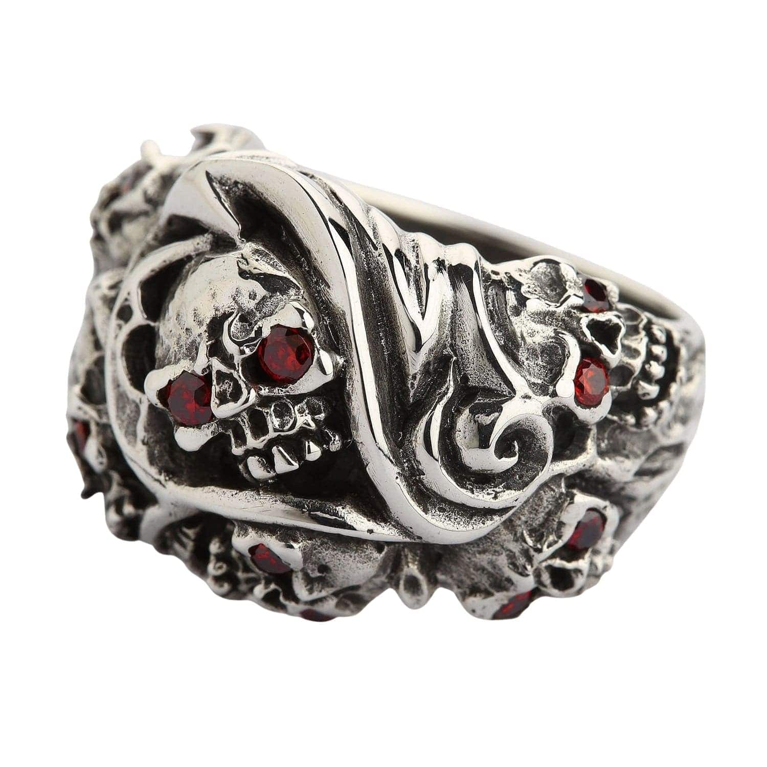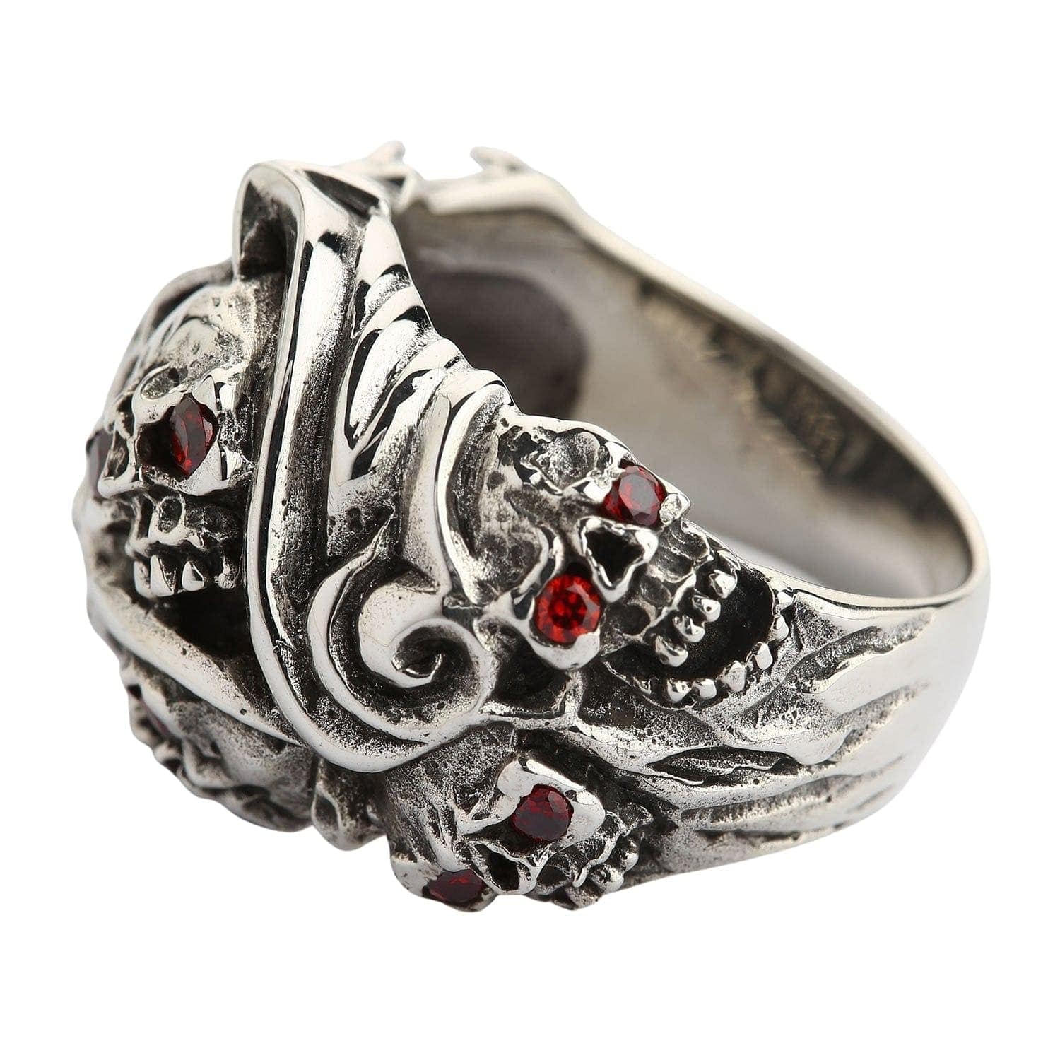 A heavy men's devil skull ring with two brilliant red stones, a premium piece of authentic biker jewelry.