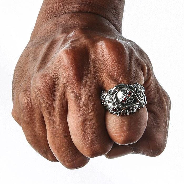 A model's hand wearing the massive and detailed, double red eye devil skull ring to demonstrate its impressive style.