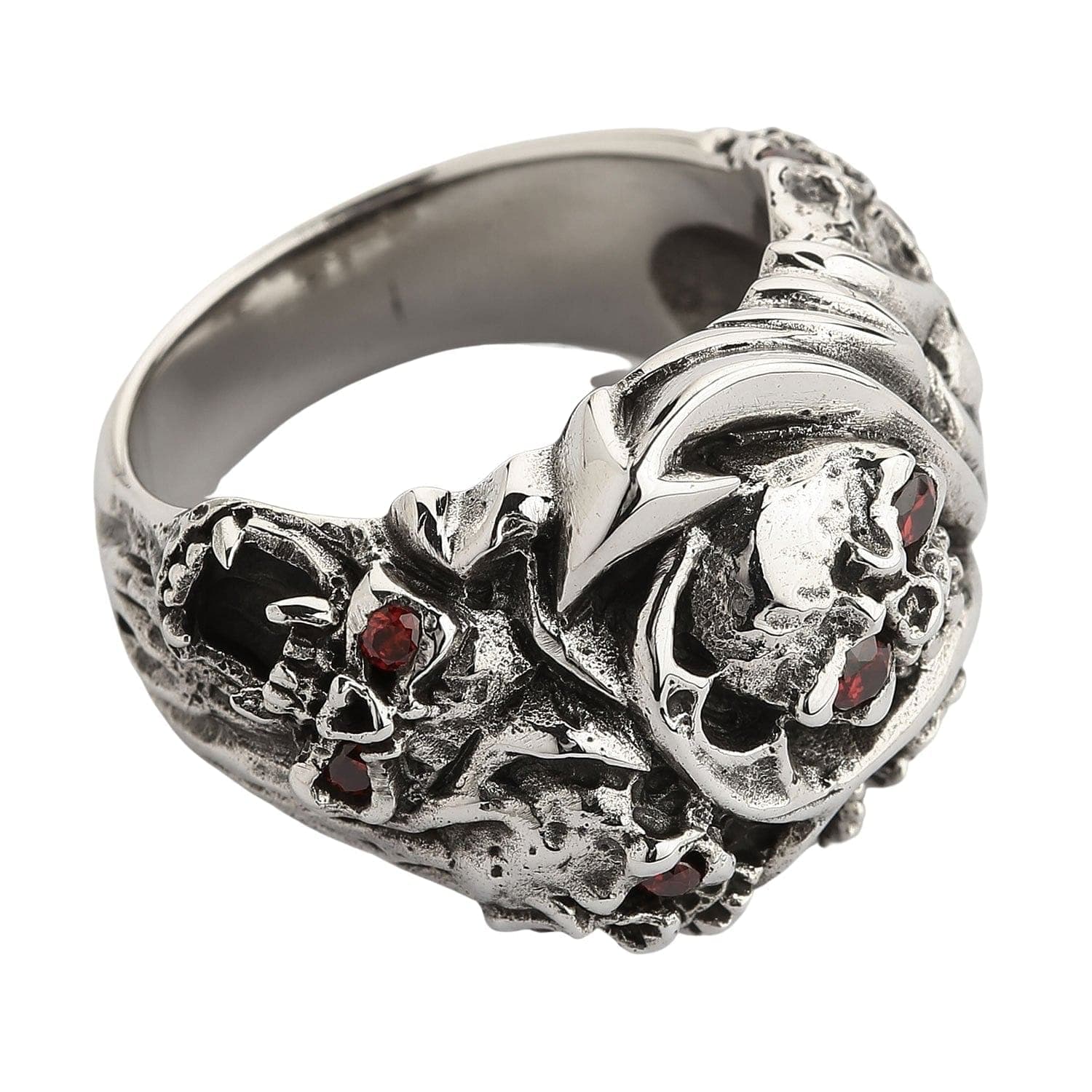 A solid sterling silver red eye devil ring with two genuine gemstone eyes and ornate, organic side carvings.