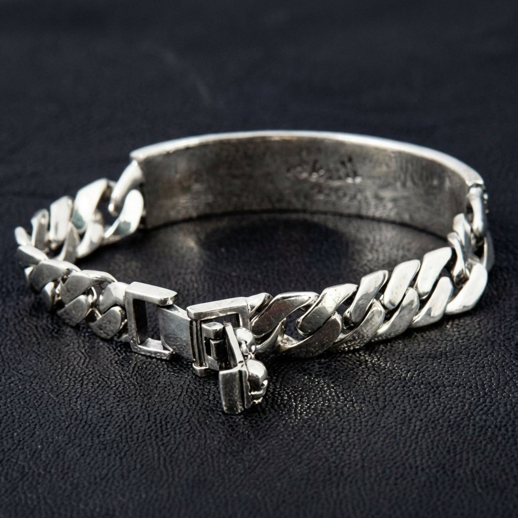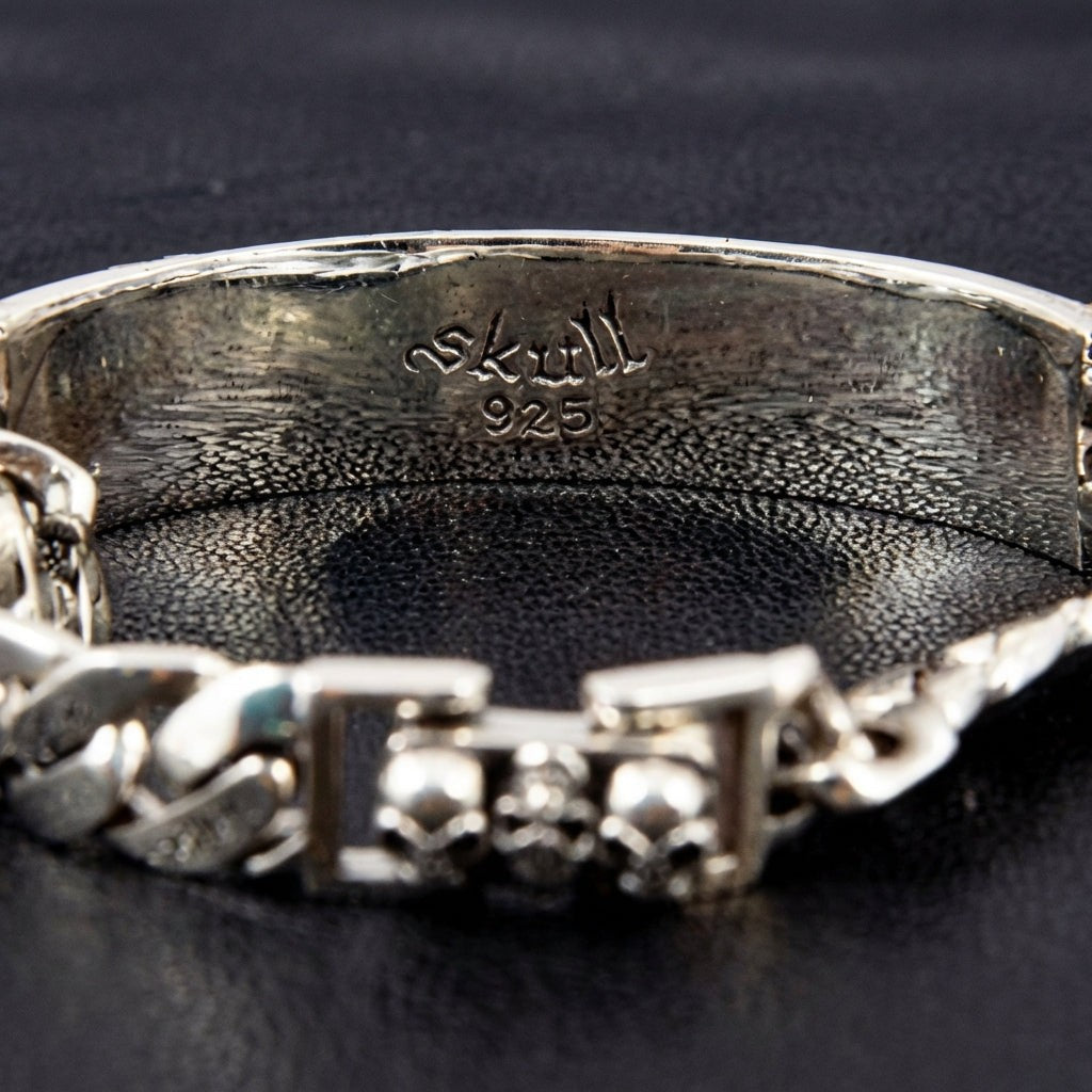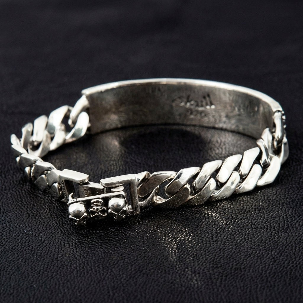 اللوحة القوية محاطة بسلسلة كوبان ثقيلة وكلاسيكية، مشهورة بقوتها الهائلة وأسلوبها الخالد في ثقافة الدراجين والهيب هوب. ومثبتة بمشبك صندوقي متين يحمل تفاصيل جماجم صغيرة، ليكون هذا السوار الثقيل بلمسة الجمجمة عملاً فنياً متكاملاً، صُمم ليكون جزءًا متينًا وذا معنى من أسلوبك المميز.
