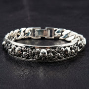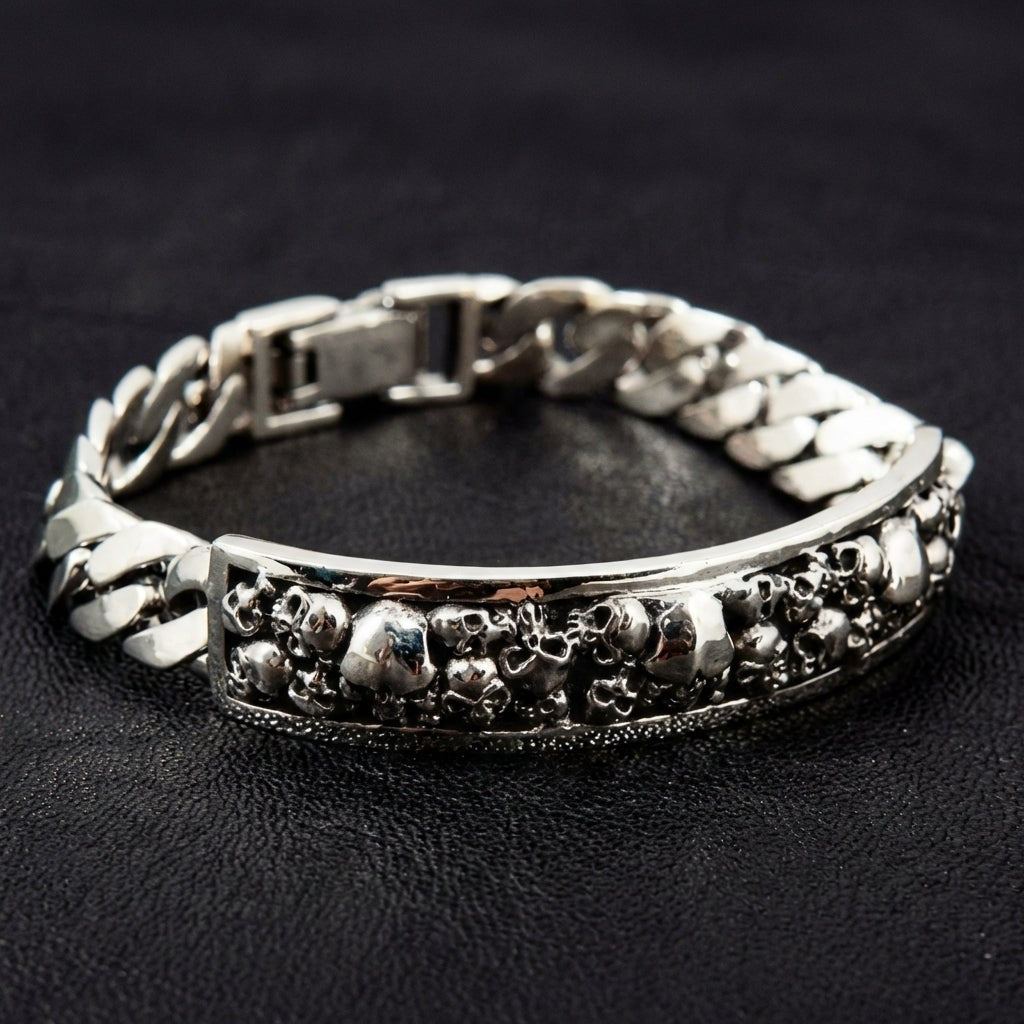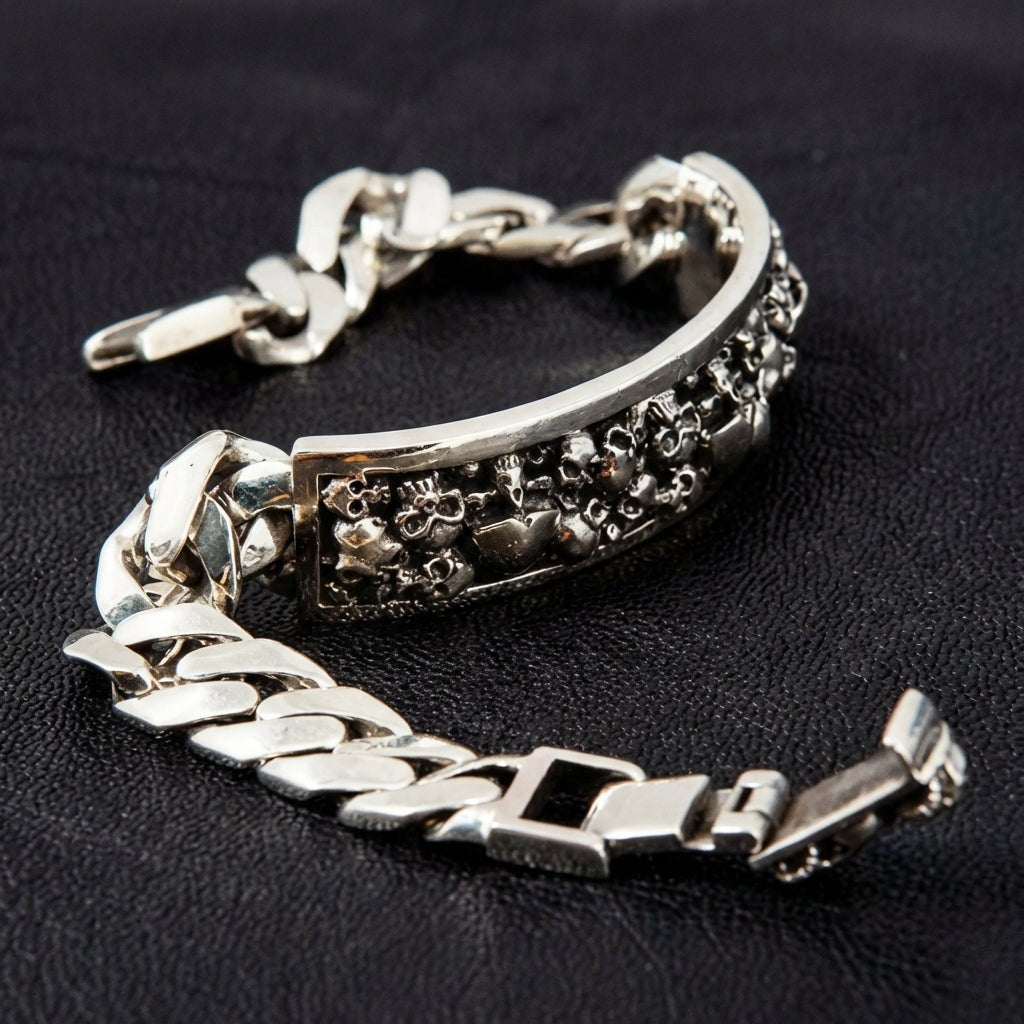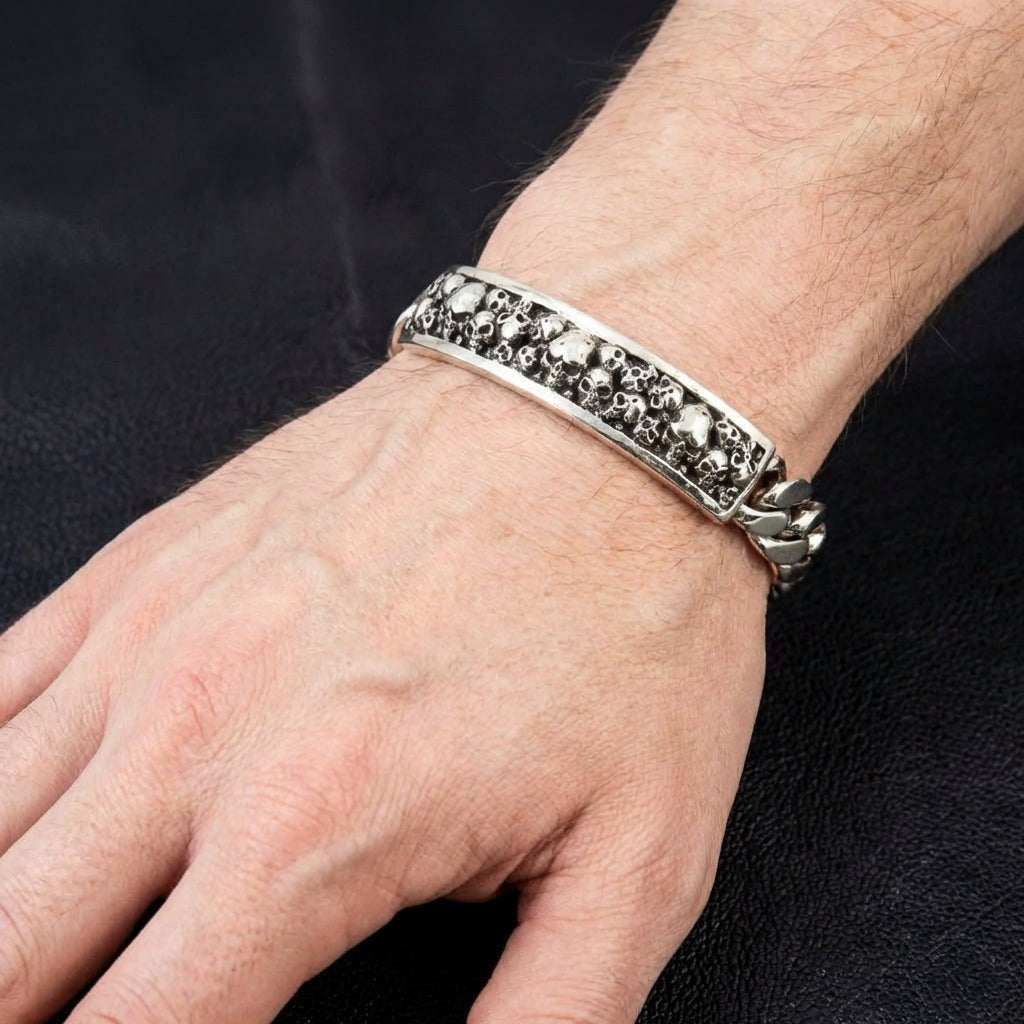 اصنع هويتك من الفضة الخالصة وقوة التمرد الخام مع هذا سوار الهوية بالجمجمة الرائع. إنه الدمج النهائي بين الأسلوب الكلاسيكي واللمسة العصرية المظلمة. يعيد ابتكار سوار الهوية التقليدي بقطعة مركزية مغطاة بالجماجم، ليخلق بياناً جريئاً عن التحدي. إنها قطعة ثقيلة الوزن للرجل الذي تُبنى هويته على القوة والأخوة والموقف الذي لا يعرف الاعتذار.