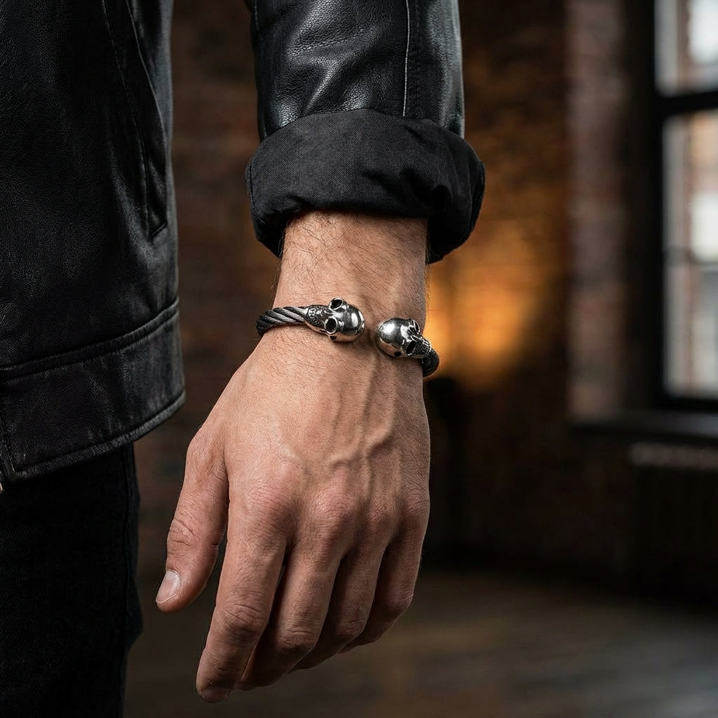 تكمن عبقرية هذا السوار في مزيجه القوي بين المواد والمعنى. الجسم عبارة عن سلك فولاذي مقاوم للصدأ سميك ومظلم، يرمز إلى القوة الصناعية الحديثة والصلابة. ويزين كل طرف من هذا السوار القوي جمجمتان مصقولتان بإتقان من فضة استرلينية 925 خالصة. هذا التباين المذهل ثنائي اللون يجمع بين ملمس الفولاذ الخام الداكن وسطوع المعدن الثمين. إنه تذكار حديث للموت (ميمينتو موري)—رمز كلاسيكي للتمرد مدعوم بقوة لا تُقهر. بوزن يبلغ 50 جرامًا وتصميم مفتوح قابل للتعديل، يمنح هذا السوار حضورًا قويًا يُرى ويُشعر به.