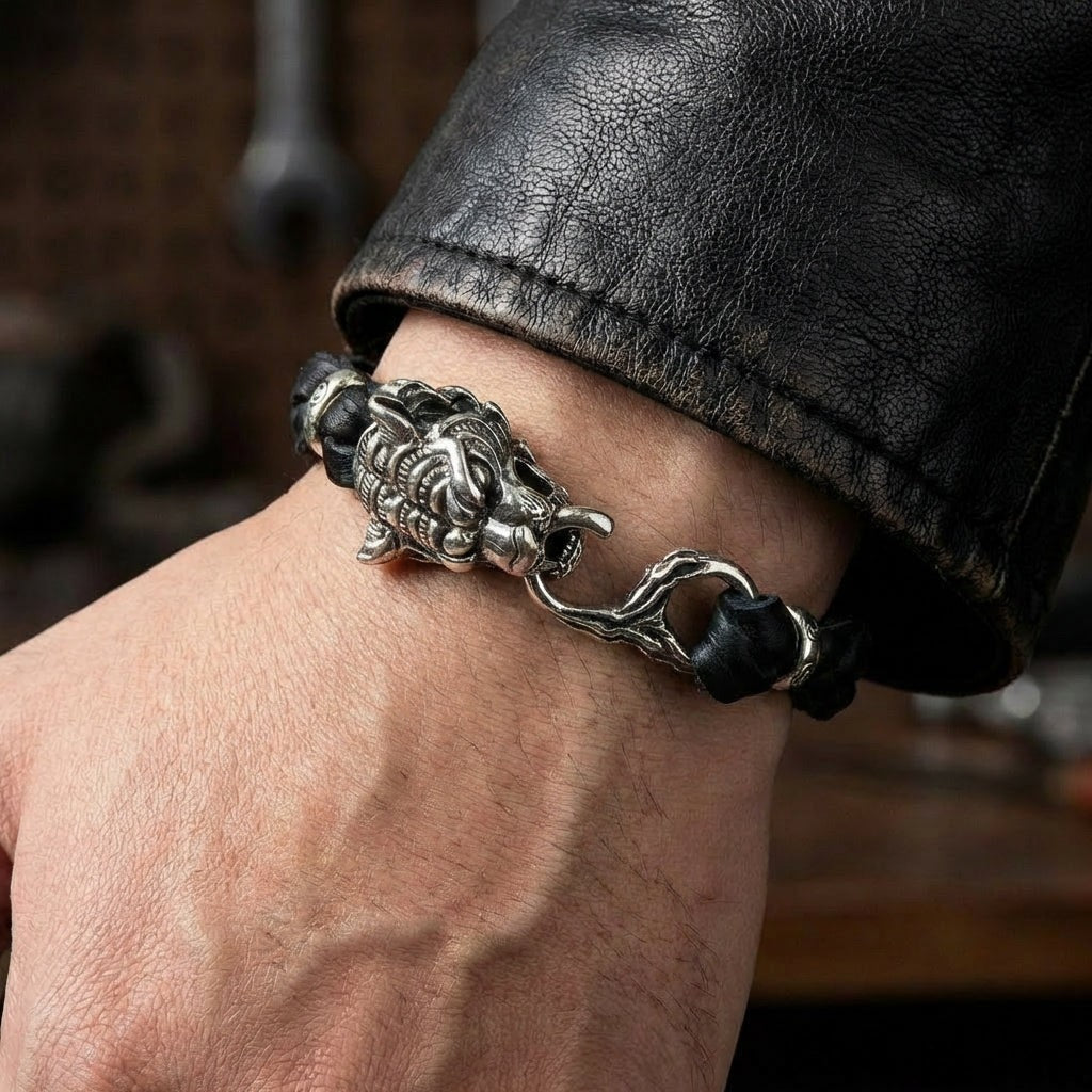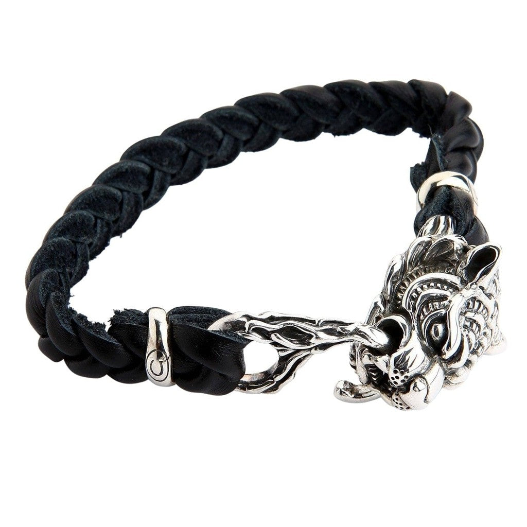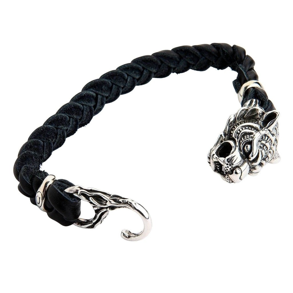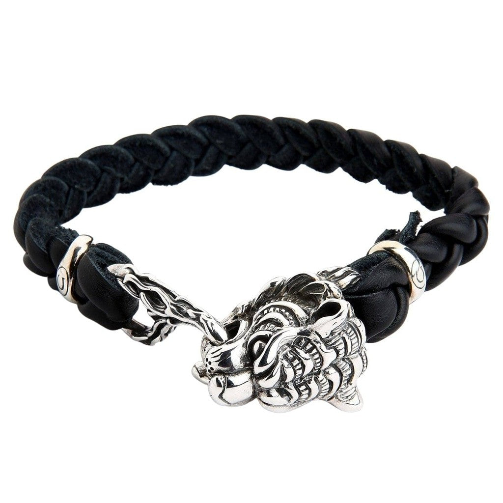 سوار الدراجين من الجلد المضفر الأصلي برأس نمر فضي
