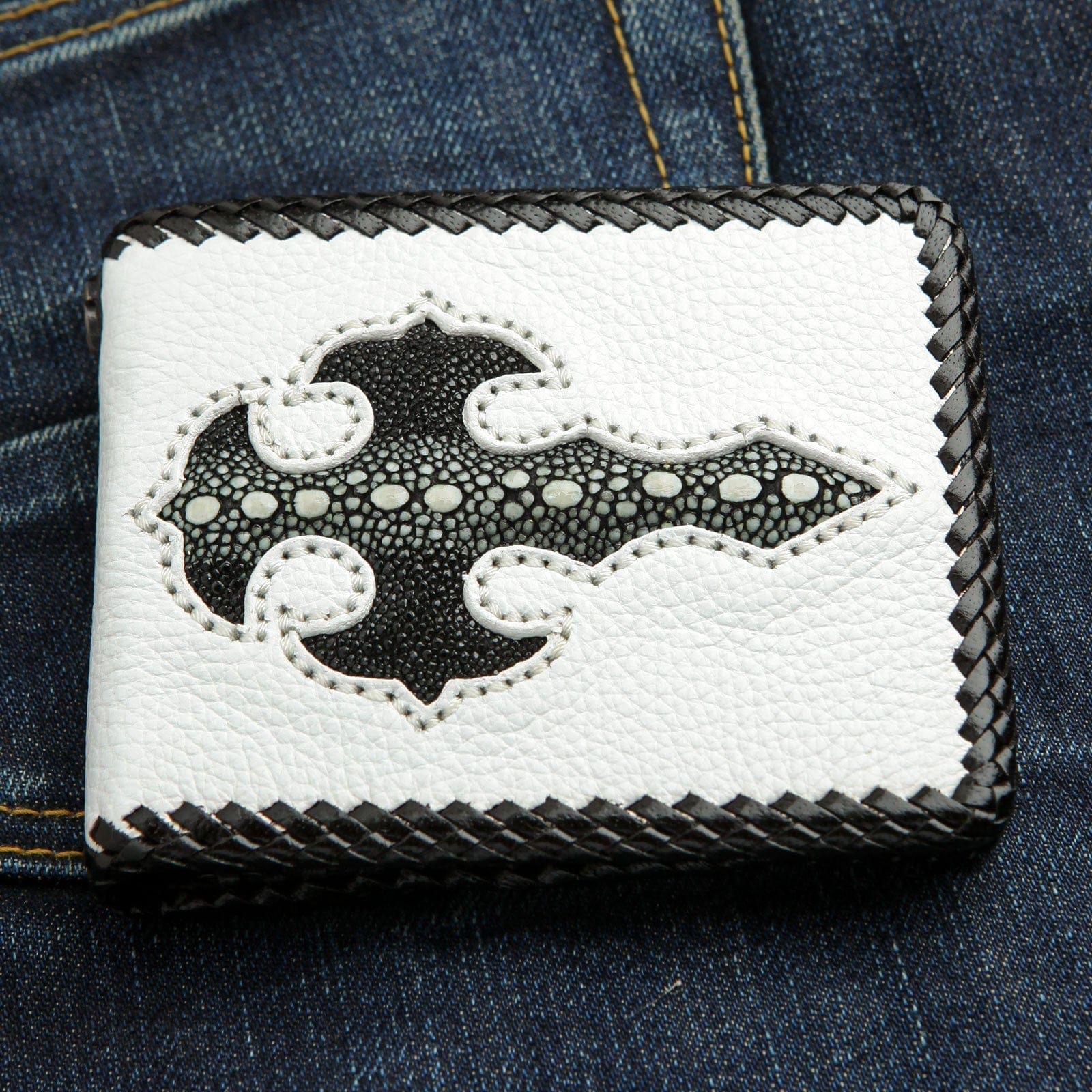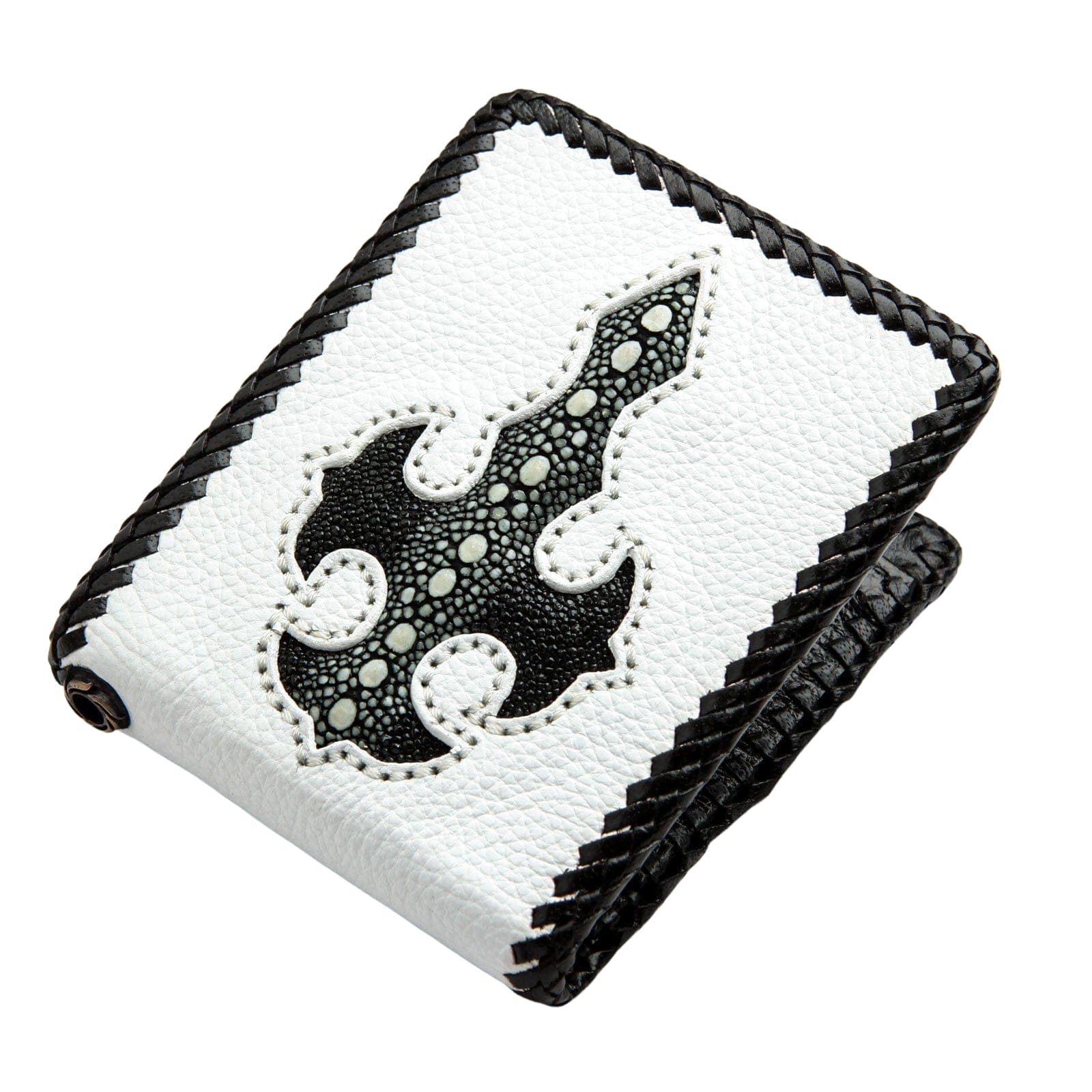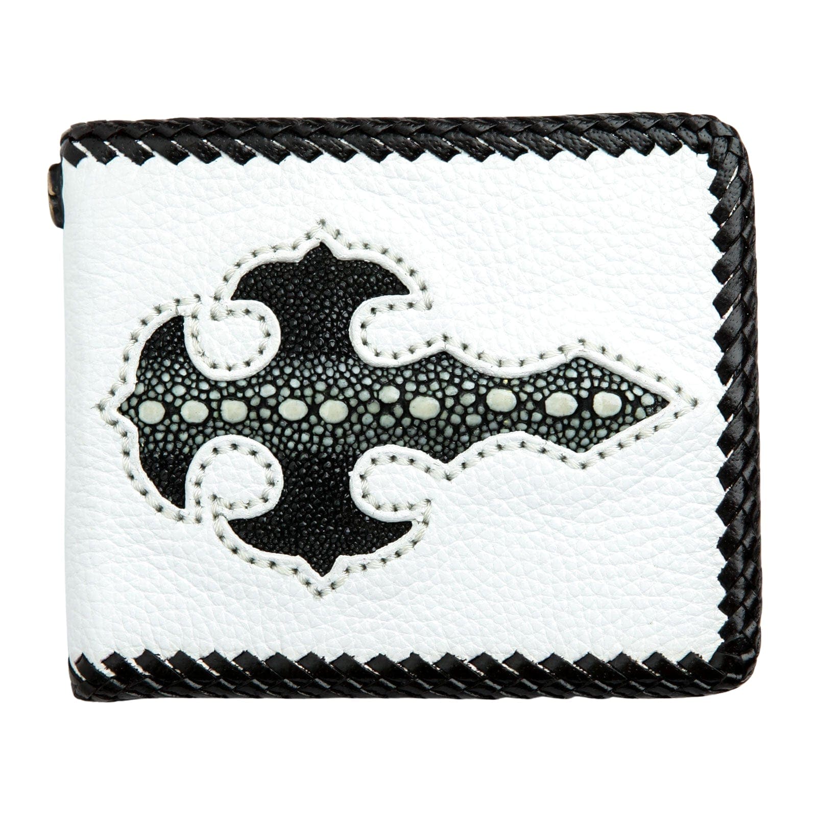 تكمن قوة هذه المحفظة في التباين البصري اللافت. الجسم مصنوع من جلد البقر الأبيض الفاخر ليشكل خلفية نظيفة وجريئة. يتوسطه صليب قوي بأسلوب قوطي مصنوع من جلد سمك الراي الأسود الأصلي. يشتهر هذا الجلد بملمسه الفريد الذي يشبه الكافيار وبمقاومته الفائقة، ليمنح التطعيم حضورًا بارزًا. يحيط القطعة كلها حافة من الجلد الأسود المجدول يدويًا، ليجمع التصميم المتباين معًا. أما الداخل، فهو عملي ومدروس ليجعل من هذه القطعة المميزة خيارًا وظيفيًا ومبهرًا في آن واحد، مع جيب عملات معدنية آمن ومساحة وفيرة للبطاقات.