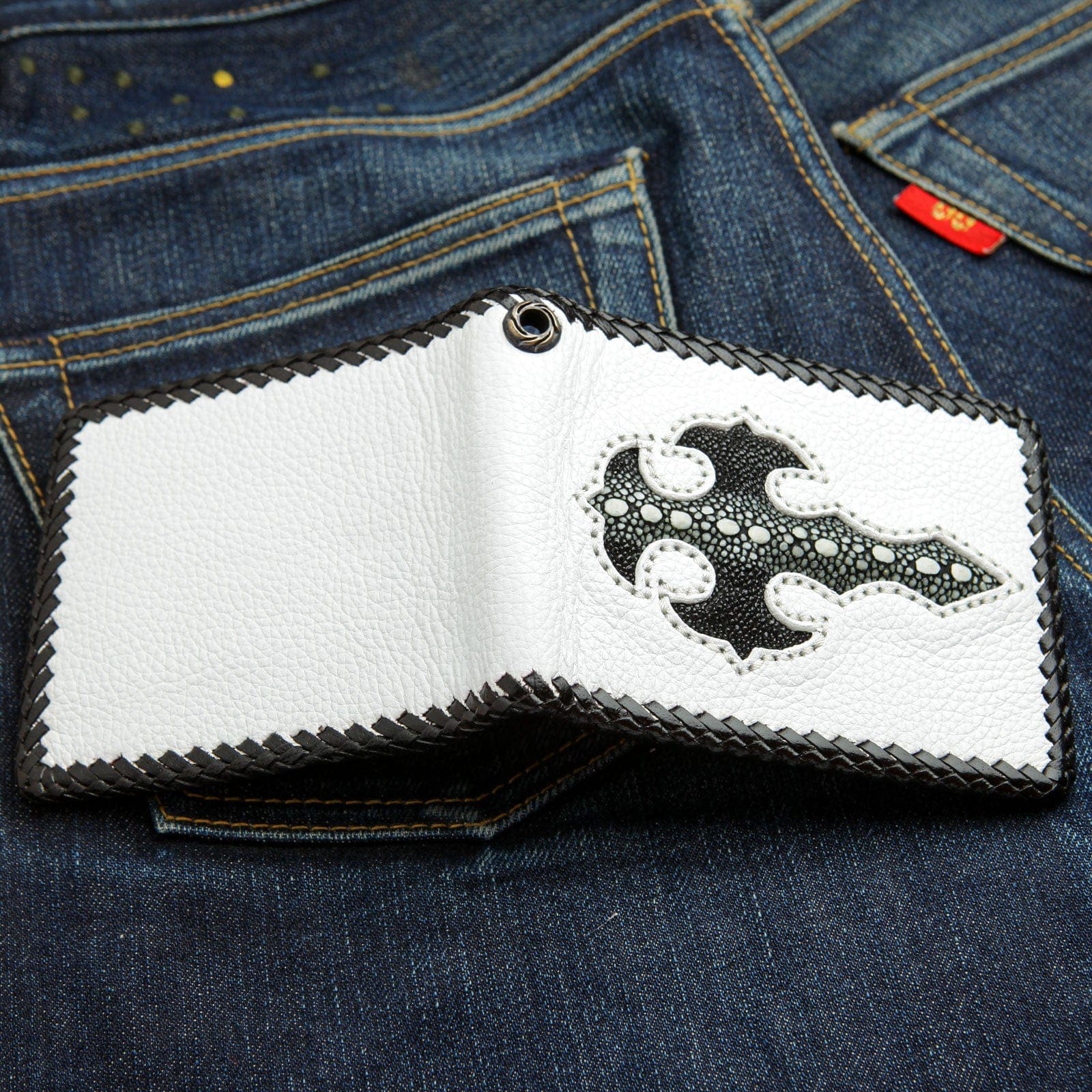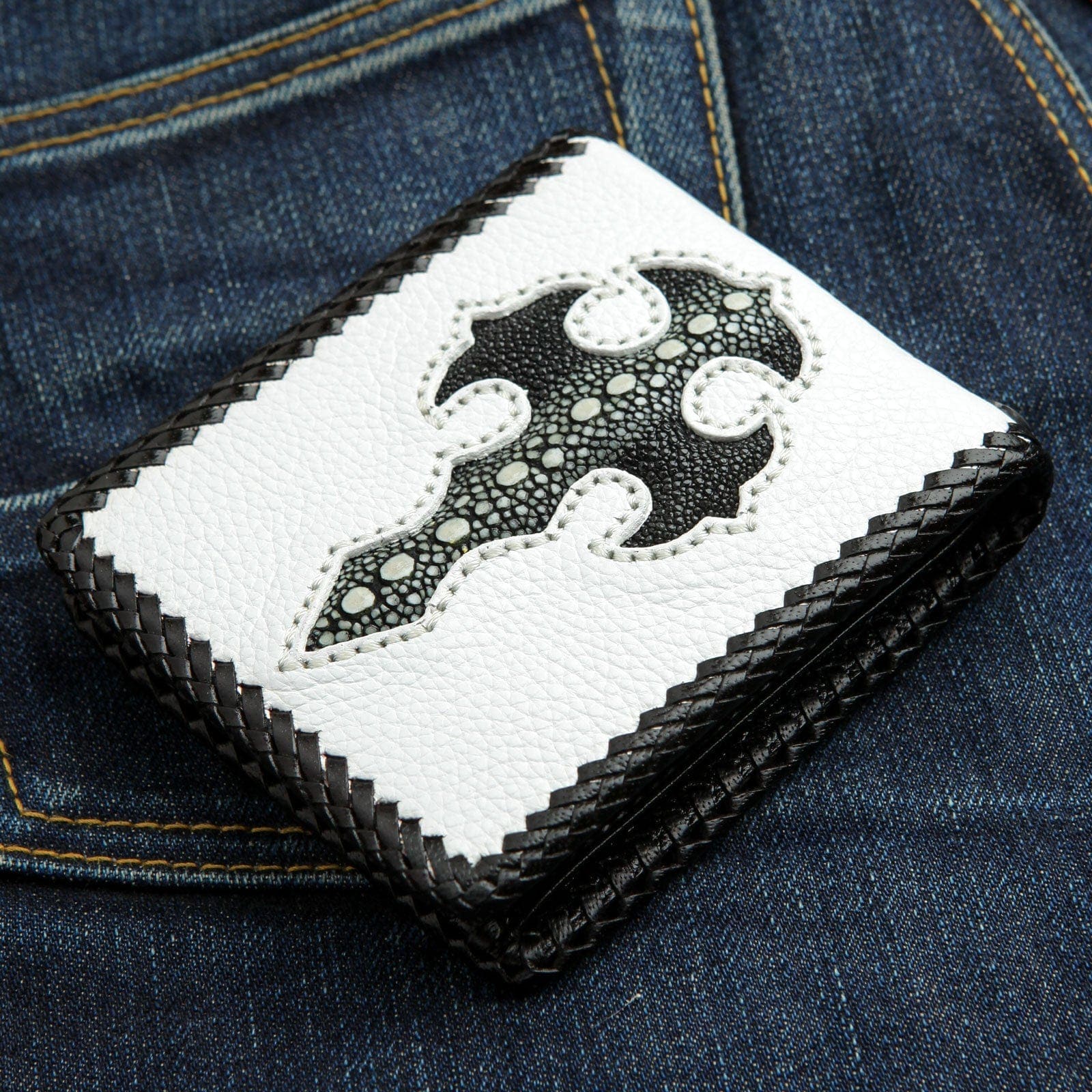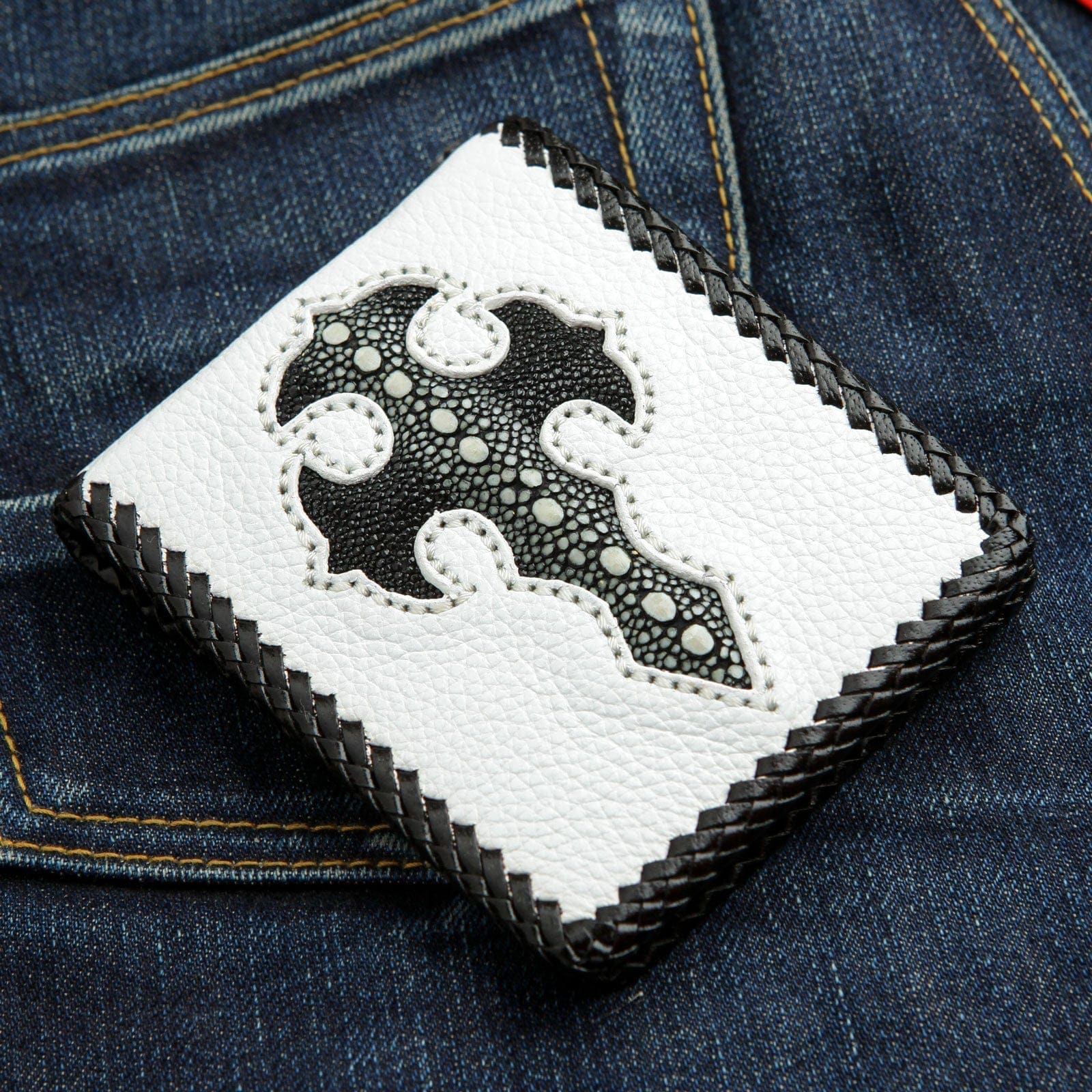 تكمن قوة هذه المحفظة في التباين البصري اللافت. الجسم مصنوع من جلد البقر الأبيض الفاخر ليشكل خلفية نظيفة وجريئة. يتوسطه صليب قوي بأسلوب قوطي مصنوع من جلد سمك الراي الأسود الأصلي. يشتهر هذا الجلد بملمسه الفريد الذي يشبه الكافيار وبمقاومته الفائقة، ليمنح التطعيم حضورًا بارزًا. يحيط القطعة كلها حافة من الجلد الأسود المجدول يدويًا، ليجمع التصميم المتباين معًا. أما الداخل، فهو عملي ومدروس ليجعل من هذه القطعة المميزة خيارًا وظيفيًا ومبهرًا في آن واحد، مع جيب عملات معدنية آمن ومساحة وفيرة للبطاقات.