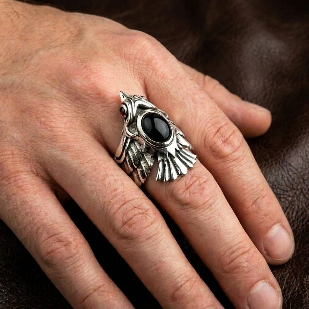 Pokud sbíráte mytologické designy — Fénix obepíná prst v celém rozsahu 360 stupňů — hlava, onyxová hruď i opeřená křídla — působí tedy jako kompletní plastika, nikoliv jen jako plochý emblém na jednoduché obroučce. Tento sochařský přístup se u šperků s tématikou ptáka znovuzrození hledá jen zřídka.
