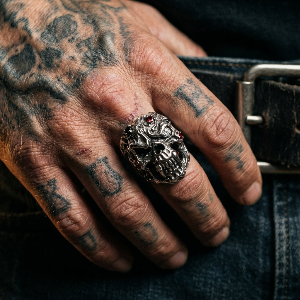 Prázdný pohled lebky je oživen řadou strategicky umístěných drahokamů. Z jednoho očního důlku září jediný zářivý čirý diamant CZ, zatímco hluboká černá a černákrvavě červený granátpo jeho rozpadající se tváři jsou roztroušeny kameny, které naznačují dlouhou a násilnou existenci. Tento kolosální kousek je vyroben z masivního stříbra a váží neuvěřitelných 35 gramů, což z něj činí definitivní kousek.motorkářské šperkypro ty, kteří žijírockerský styl. Další hrozivé vzory najdete v naší kompletní kolekci.Prsteny s lebkou.