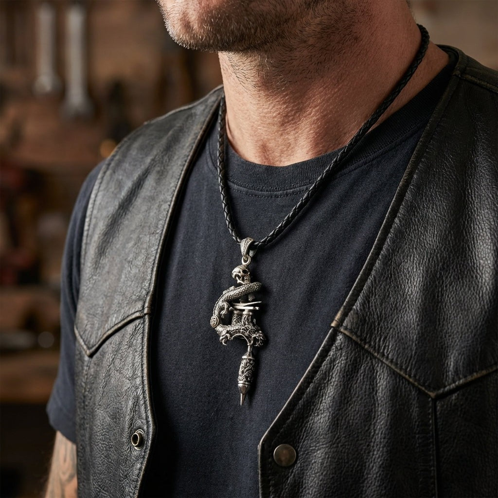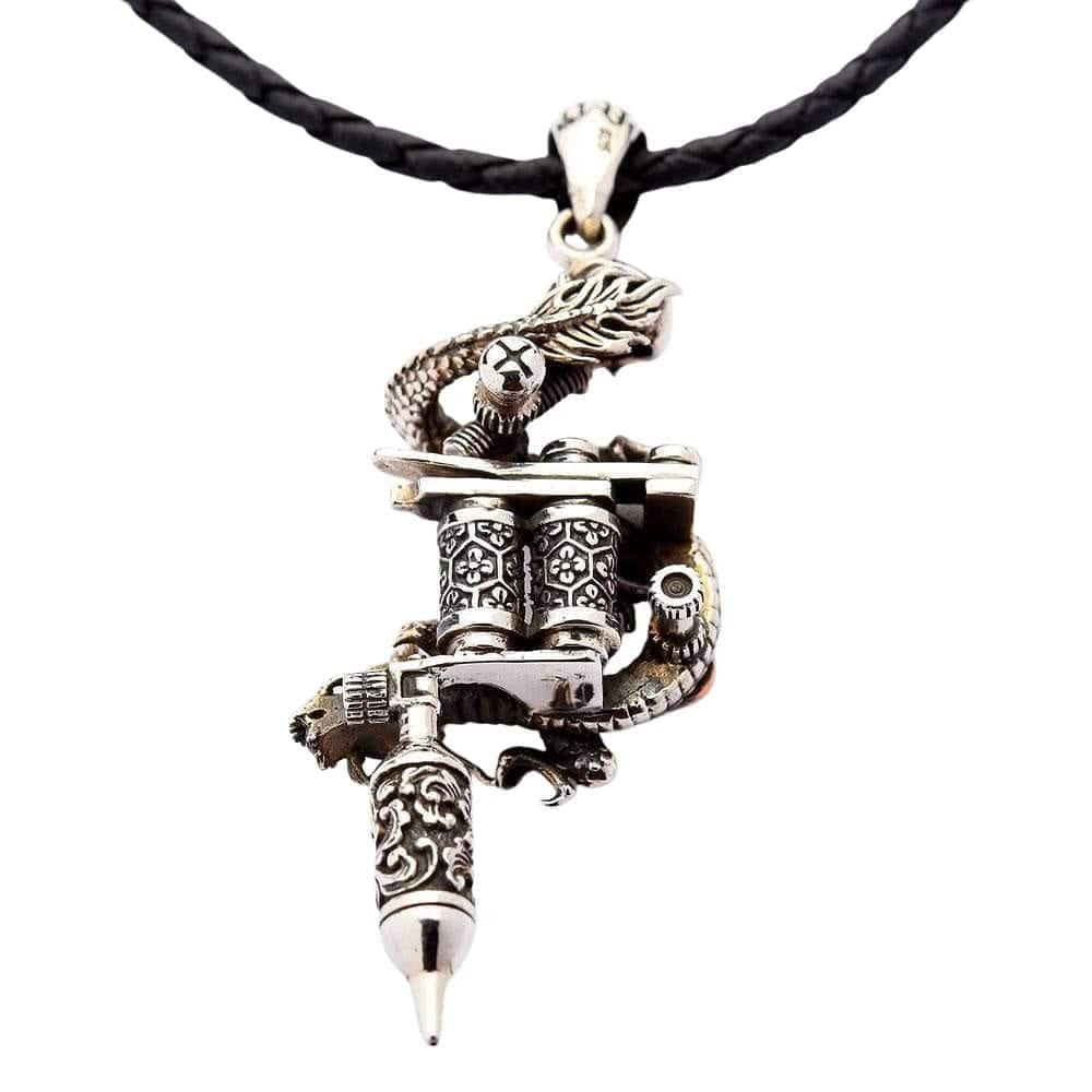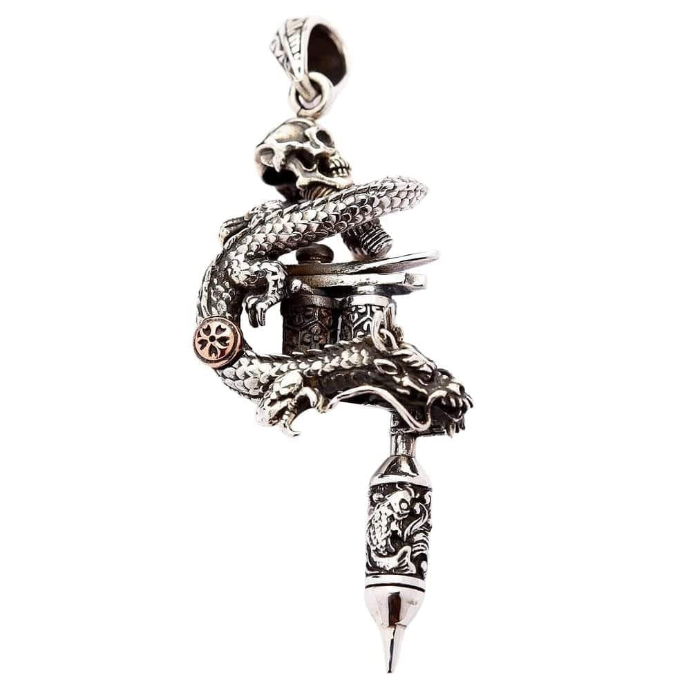Ikonické tetování:Jedinečný přívěsek sdrakalebkaovinutý kolem detailníhotetovací strojek.