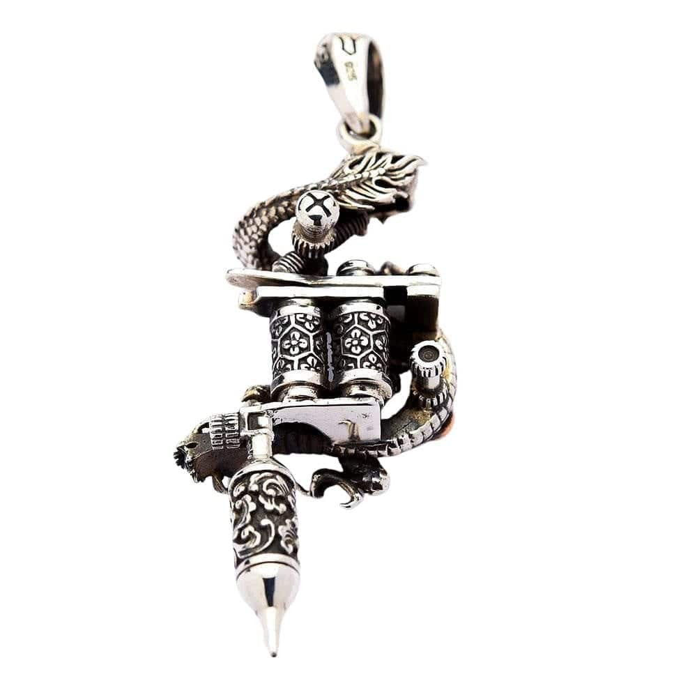 Tento přívěsek jemakabróznímistrovské dílo 3D umění. Amýtický, v měřítkudrakobtáčí své tělo kolem klasickéhotetovací strojek, jeho divoká hlava se dívá dopředu. Nahoře se šklebílebkaslouží jako zástava, jako by se kolem ní vinul dračí ocas. Šperk je bohatý na detaily, od vyrytých závitů a hrotu jehly až po vyřezávaný ocas.mosazný akcentna dračím těle, čímž vzniká ohromujícídvoubarevnéúčinek.