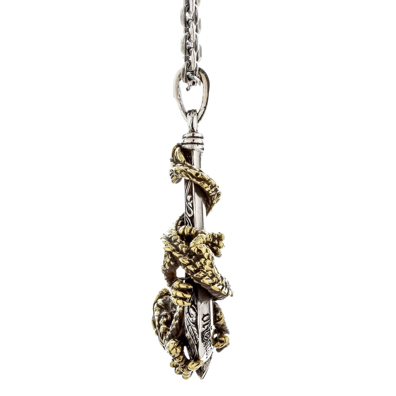 ⚫🟡 Solid Silver & Brass: A stunning two-tone piece crafted from a solid 925 sterling silver fish hook and a detailed, entwined genuine polished brass dragon.