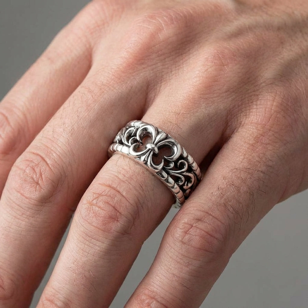 (Tělo obsahu) Charakteristickým rysem tohoto kroužku je opakující seFleur-de-lismotiv, historickýheraldický symbolpředstavuje vznešenost, sílu a světlo. Na rozdíl od masivních pečetních prstenů má tento šperk ohromující vzhled.ažurový design(styl výřezu), kde je vzor vyřezán skrz pásek, což vytváří pocit hloubky a vzdušnosti.
