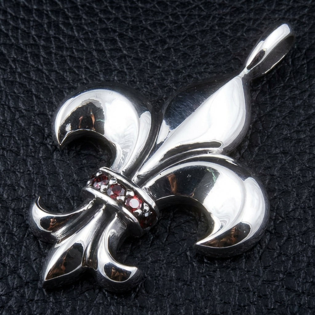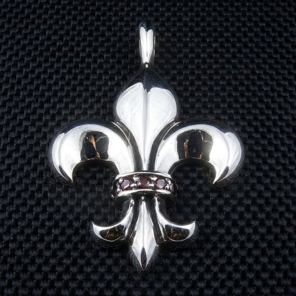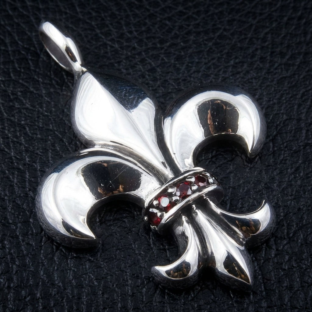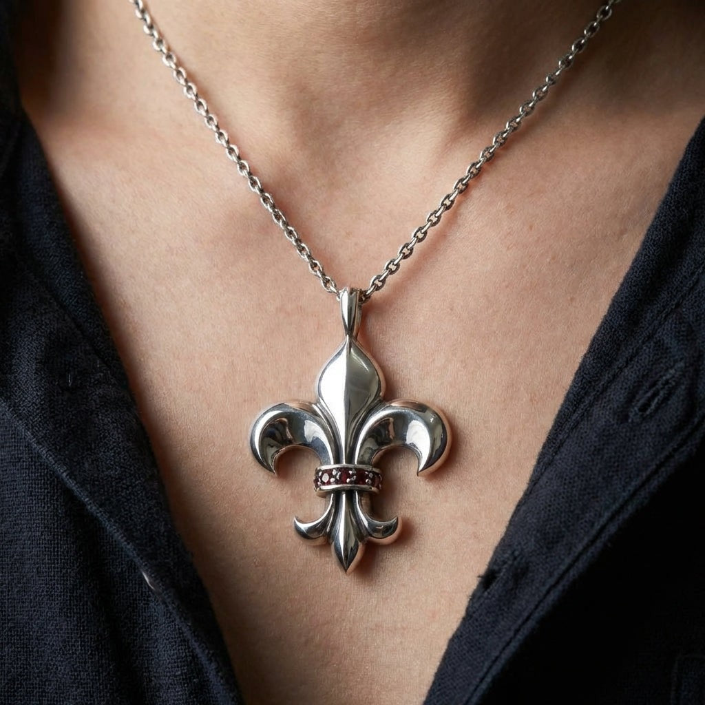 Tento přívěsek mistrovsky zachycuje ikonickou siluetu letadla.Fleur de Lis, aheraldický znaksynonymem proFrancouzská královská rodinaa moc po více než tisíc let. Tři okvětní lístky, které představují víru, moudrost a rytířskost, jsou vytesány z masivního stříbra aručně leštěnédo dokonalého zrcadlového lesku. Uprostřed tohoto vznešeného emblému se nachází zářivý pás sytě červené barvy, osazený kanálky.pravé granátové kameny. Klenotvášeň a ochrana, granáty dodávají celému šperku zářivý, luxusní kontrast a povznášejí ho. Díky své značné hmotnosti a odvážným rozměrům je tento přívěsek silným prohlášením o trvalé síle a cti.