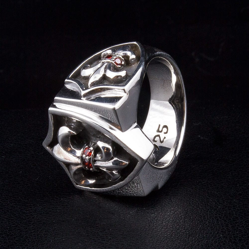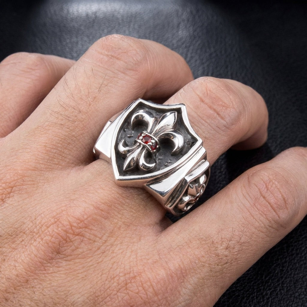 Objevte nadčasovou eleganci našeho prstenu se štítem Fleur De Lis, mistrovsky ručně vyrobeného šperku, který spojuje středověké dědictví s moderním gotickým stylem. Tento úchvatný pánský stříbrný prsten obsahuje ikonický symbol květu lilie zasazený do klasického designu štítu, který zdobí pravé červené granátové drahokamy, jež nádherně zachycují světlo. Ať už vás přitahuje francouzská královská symbolika, estetika motorkářských šperků, nebo prostě jen oceňujete výjimečné stříbrnické řemeslné zpracování, tento výrazný prsten přináší nepřekonatelnou přítomnost a kvalitu.