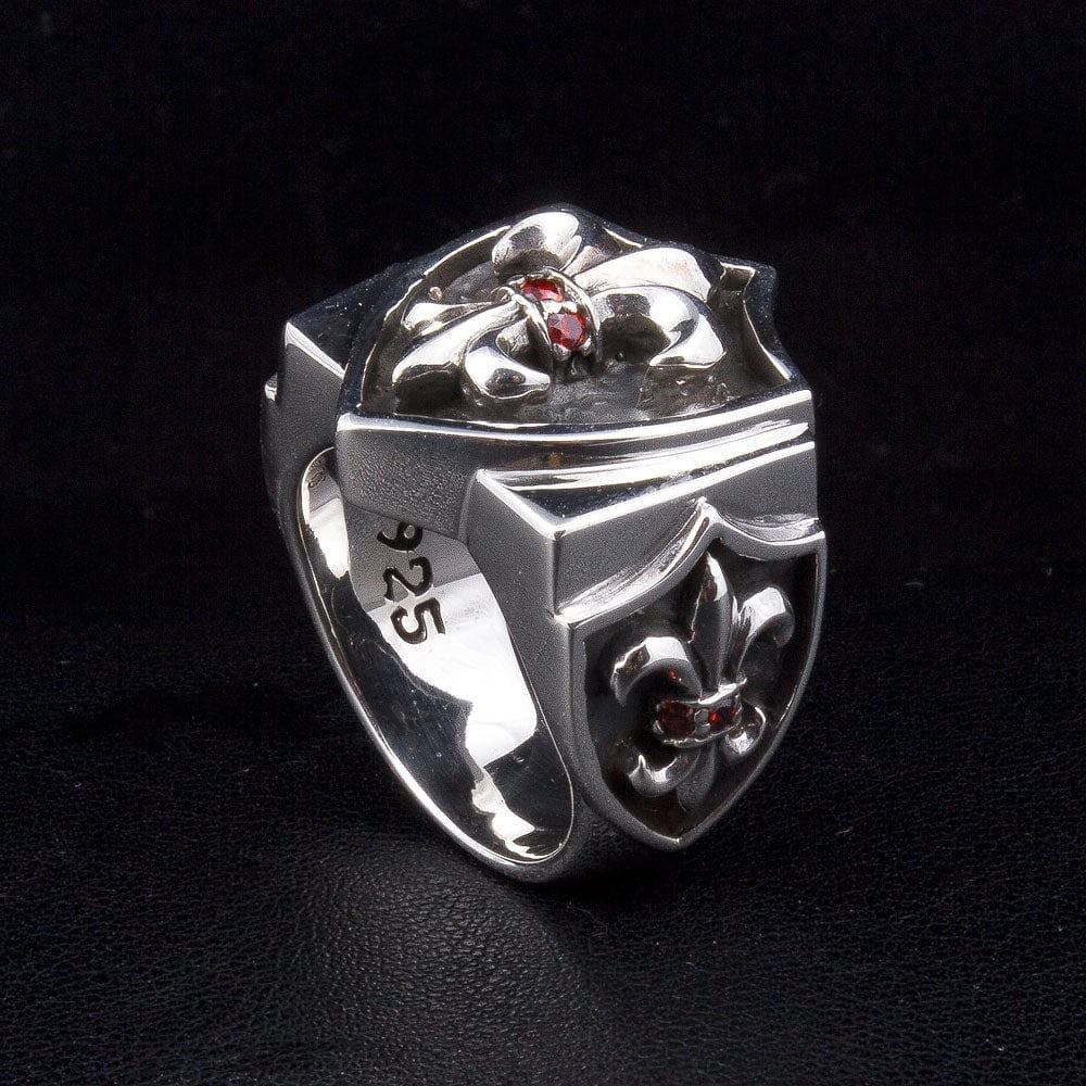 Prsten Fleur De Lis Shield Ring ze stříbra 925 s červenými granátovými kameny