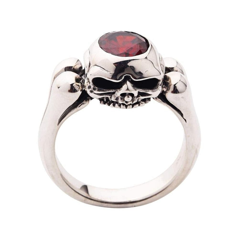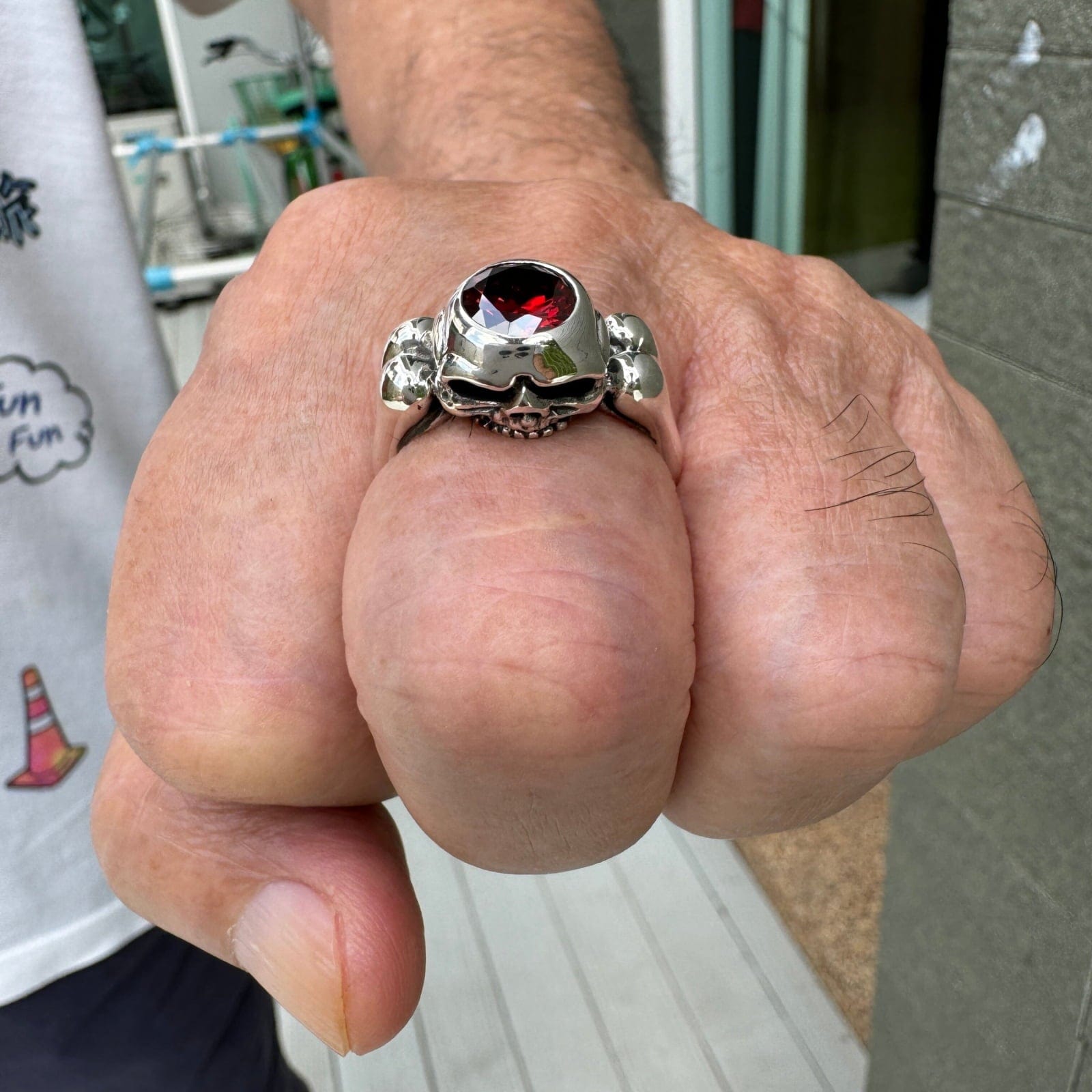 💎 Brilliant Red Garnet: Features a large, round-cut 8mm x 8mm genuine red Garnet stone, bezel-set into the main skull’s forehead like a fiery, all-seeing third eye.