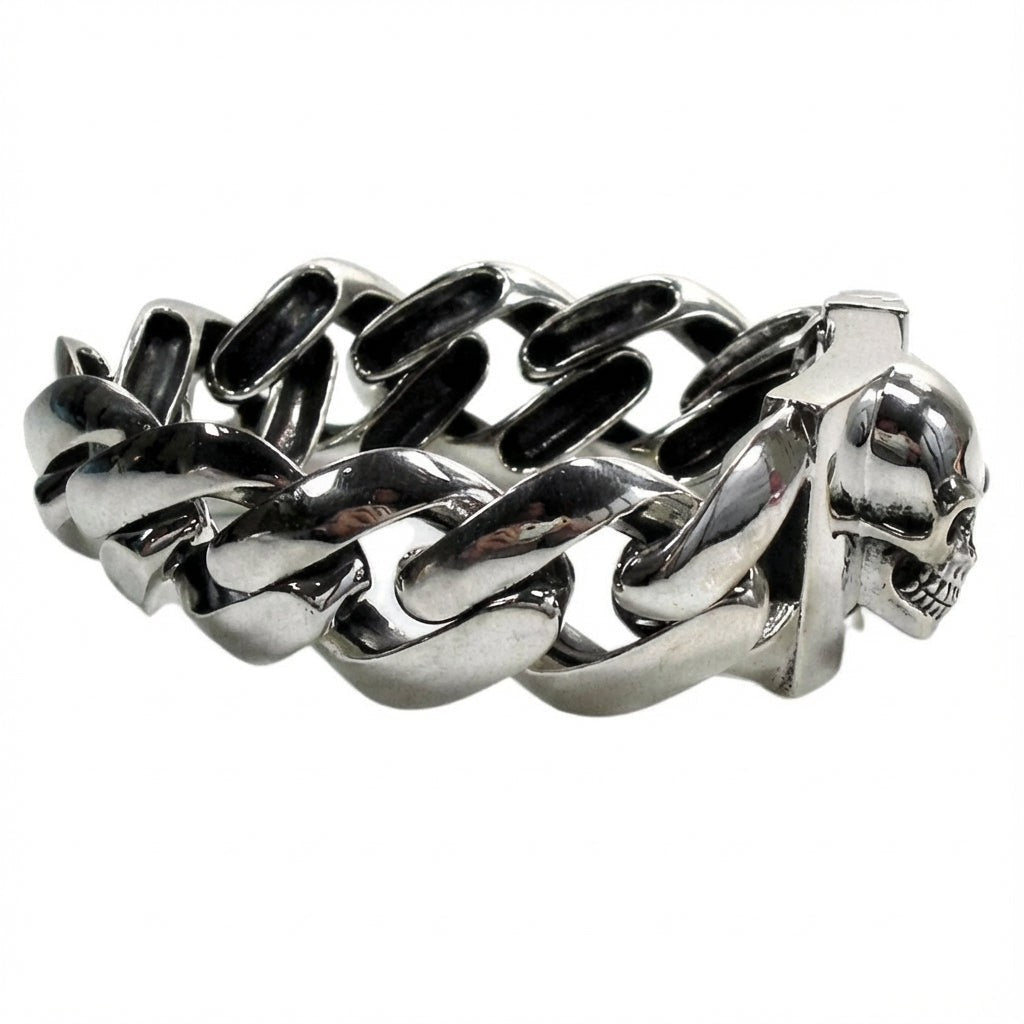 Udělejte odvážné prohlášení s našimiTěžký lebka obrubník řetěz Sterling Silver Biker náramek. Tento výjimečný kusmotorkářské šperkyvzbuzuje respekt svým hrozivým vzhledem a vynikajícím řemeslným zpracováním. Váží úctyhodných 181 gramů ryzího stříbra 925/1000.náramek s lebkoupřináší výrazný pocit, který vyžadují vážní jezdci a milovníci gotického stylu.