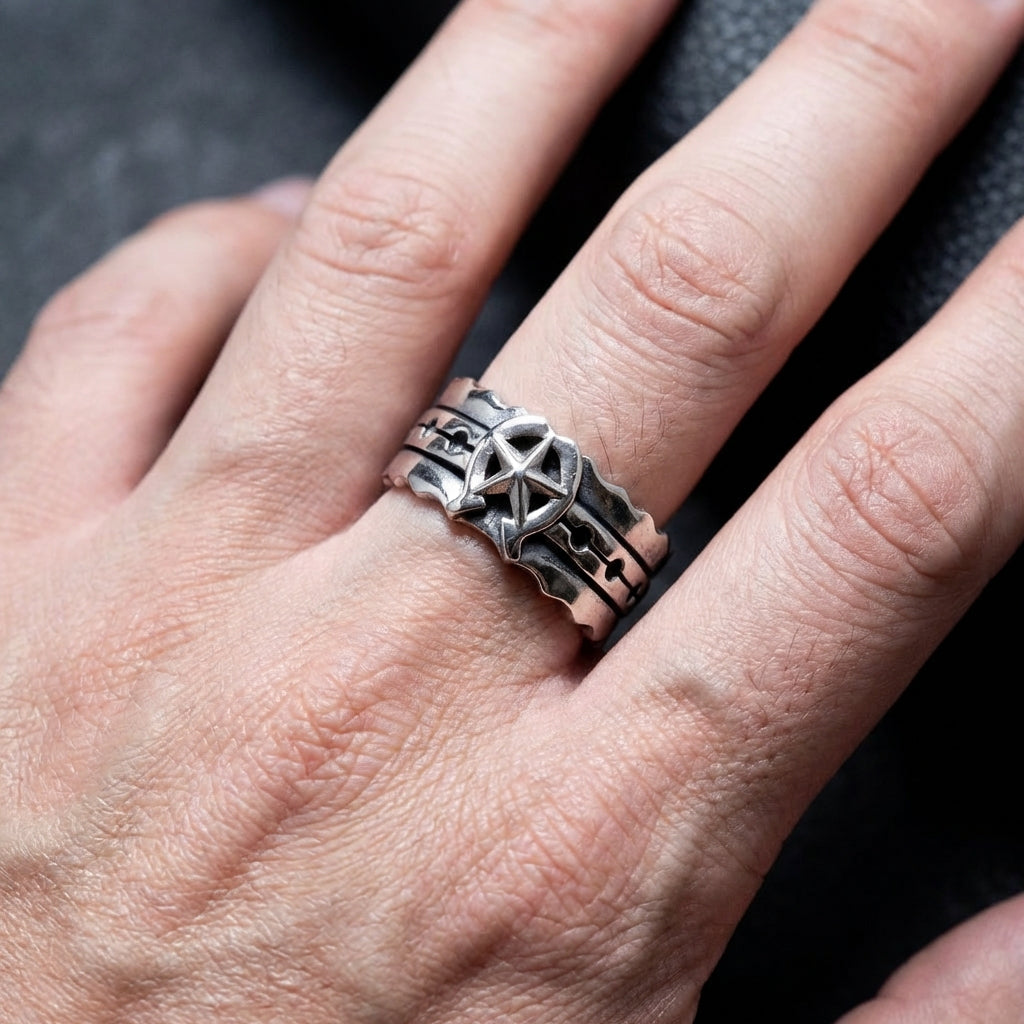 Odpověď: Tento prsten dokonale kombinuje styly. Je to klíčový kousek v našemPodkovovité kroužkyaHvězdné prstenykolekce s drsným stylem, který je ideální proWesternové šperkynebo dokonce nenápadnýMotorkářský prstenvzhled.
