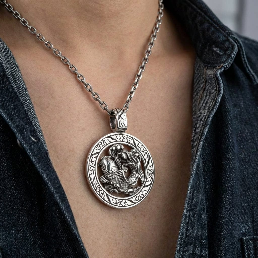 🐟Symbolický medailon ryby koi:Nádherně propracovanýJaponský kapr Koiv dynamické plavecké póze, která symbolizuje sílu a štěstí.
