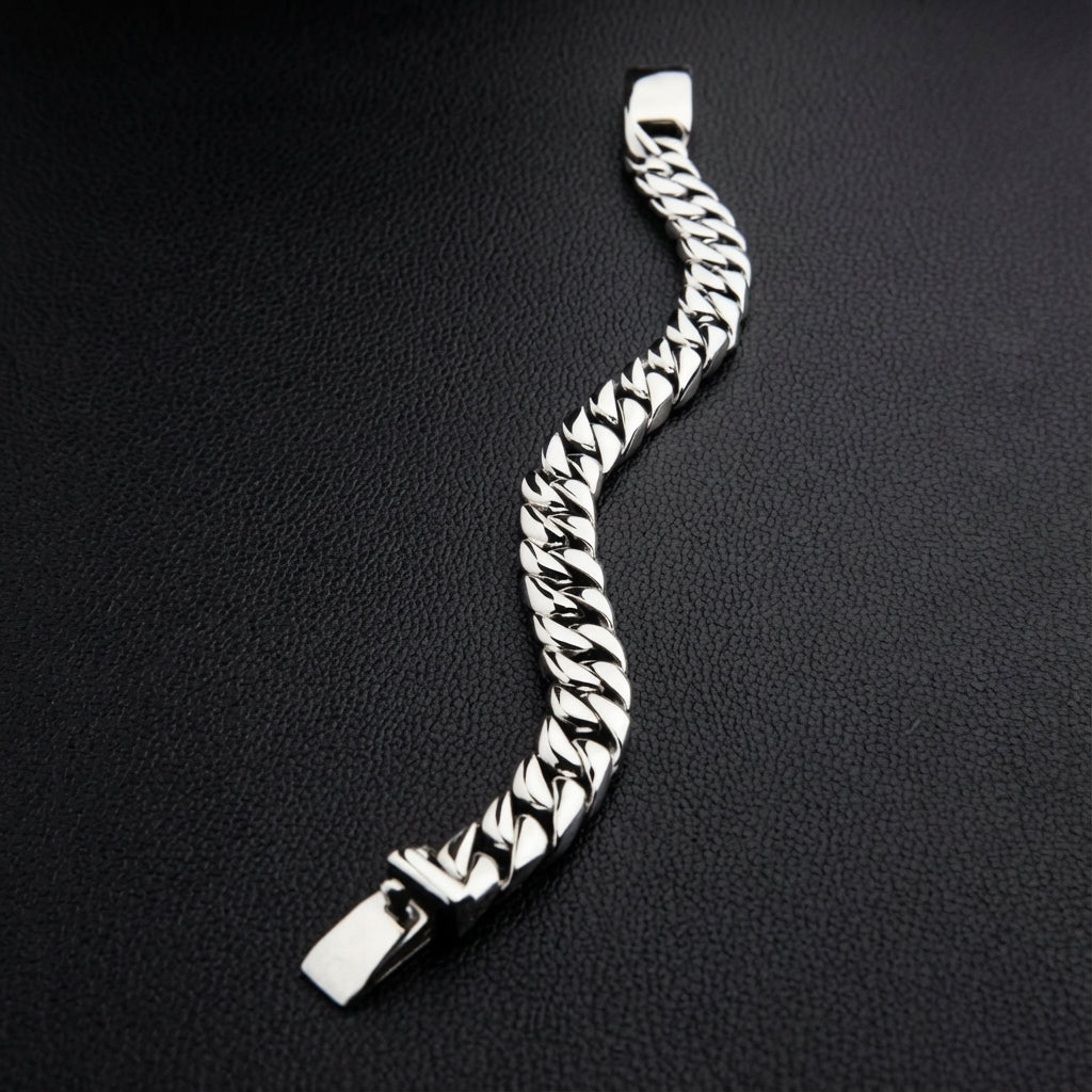 Krása tohoto náramku spočívá v jeho nekompromisní kvalitě a ikonickém designu. KlasickýKubánský obrubník odkazstyl, měření dominantního11 mmna šířku, těsněpropojovací článkys přesně broušenými zkosenými hranami, které při každém pohybu vytvářejí kaskádu světla. Skutečná síla tohoto díla spočívá v jeho podstatě. Váží kolosální70 gramů, je to skutečnětěžká váhanáramek, který působí na zápěstí uspokojivě a autoritativně. Každý článek je vykovaný zmasivní stříbro 925aručně leštěnéna brilantnízrcadlový povrch. Jedná se odědičná kvalitakus, vyrobený prodlouhověkosta bude se hodit pro každou příležitost.