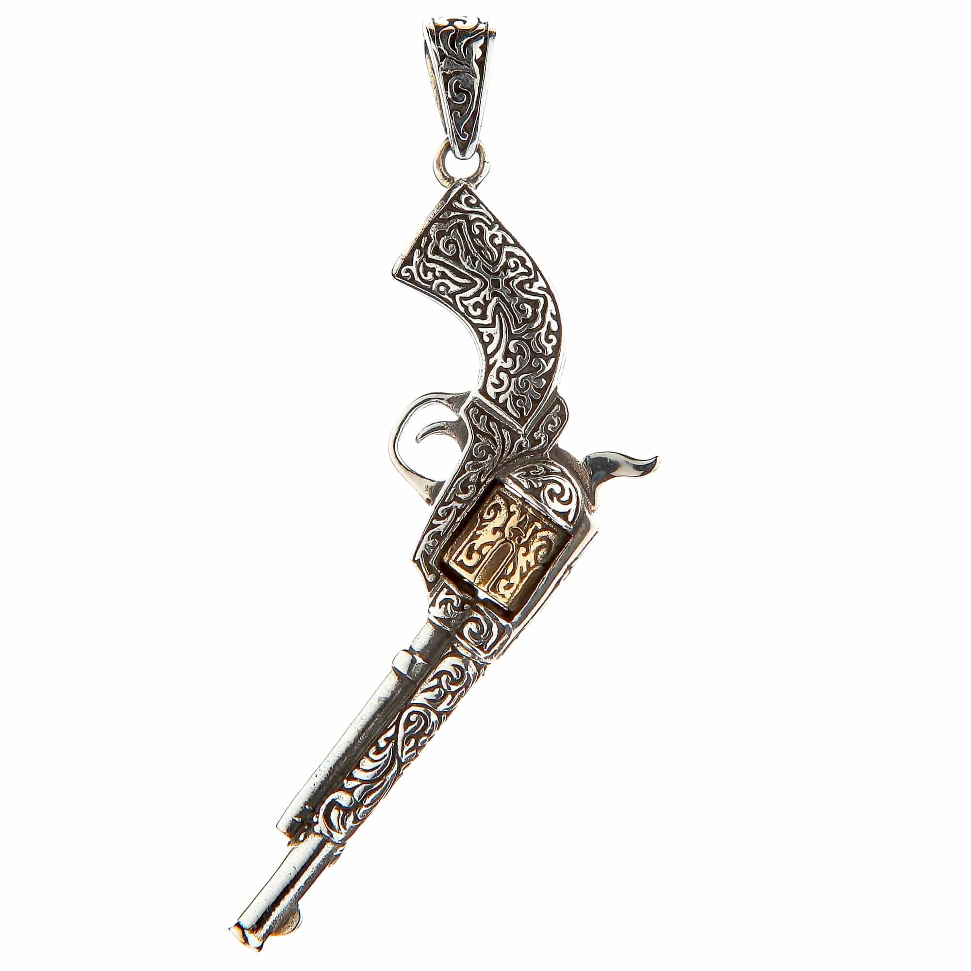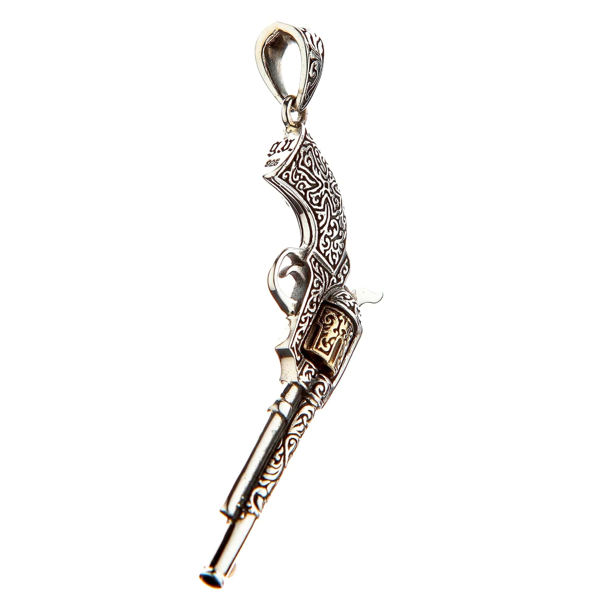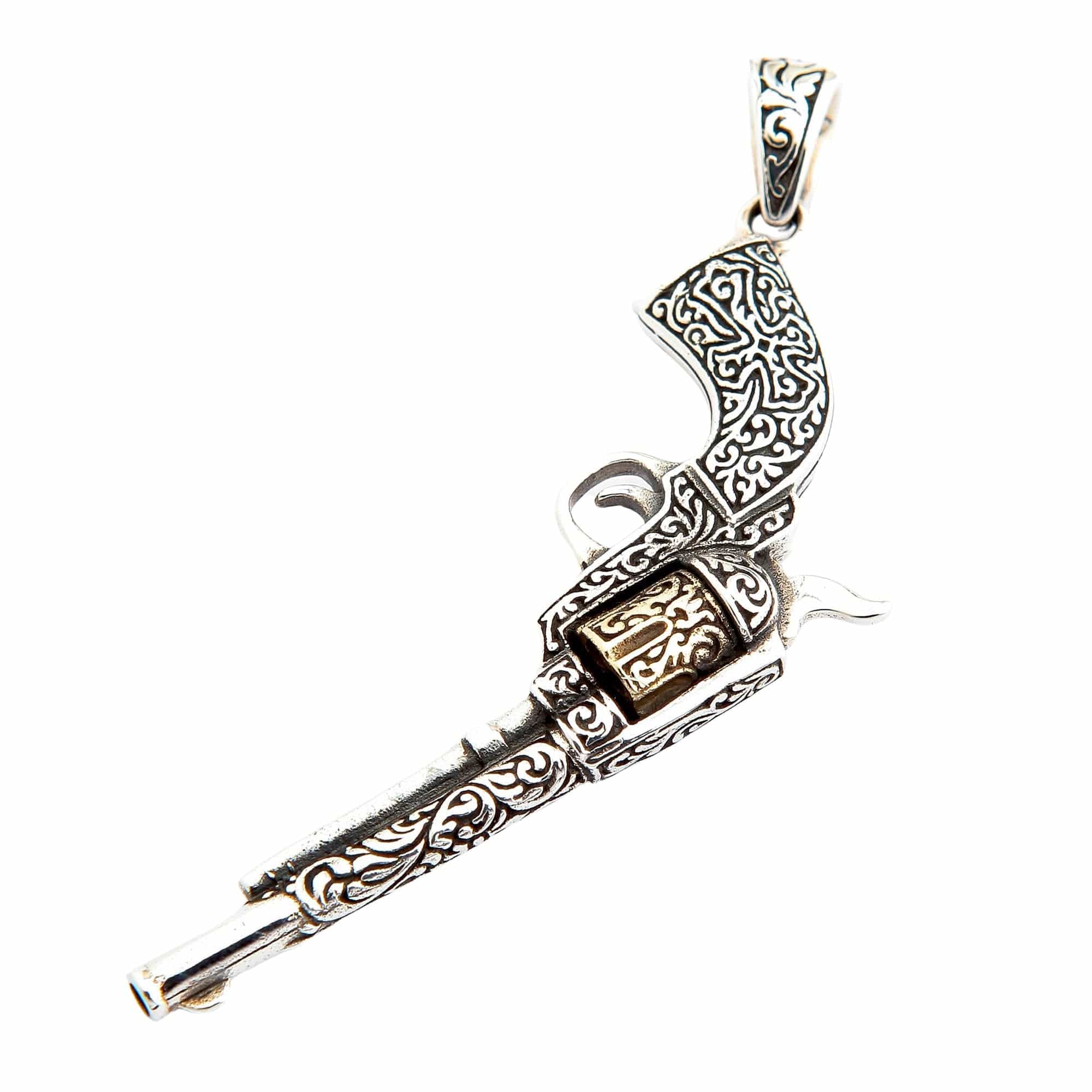 🔫 Vintage Revolver Design: A meticulously detailed pendant shaped like a classic Western gun, covered in intricate scrollwork.