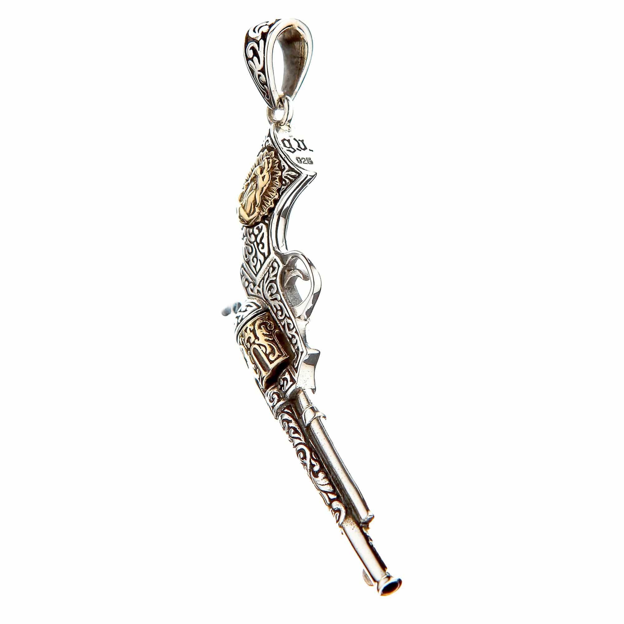 This pendant is a miniature work of art, inspired by the ornate vintage revolvers famous throughout the American frontier. The entire body of the pistol is covered in intricate, hand-engraved scrollwork, reminiscent of classic baroque engraving. The design is both beautiful and dangerous, perfectly capturing the duality of the gunslinger lifestyle.