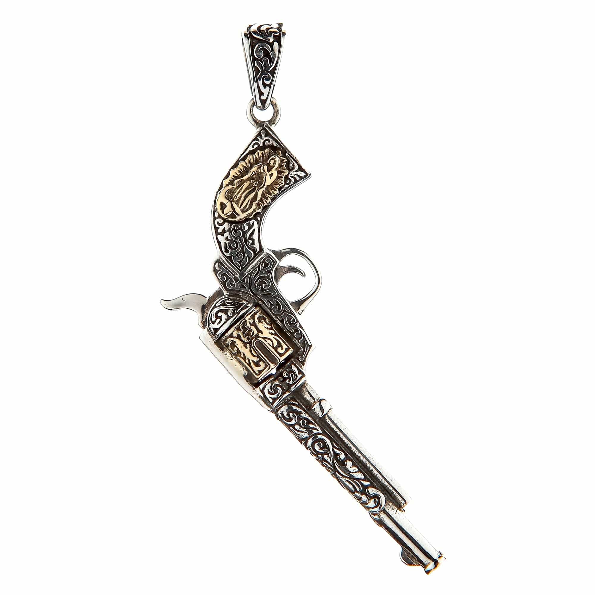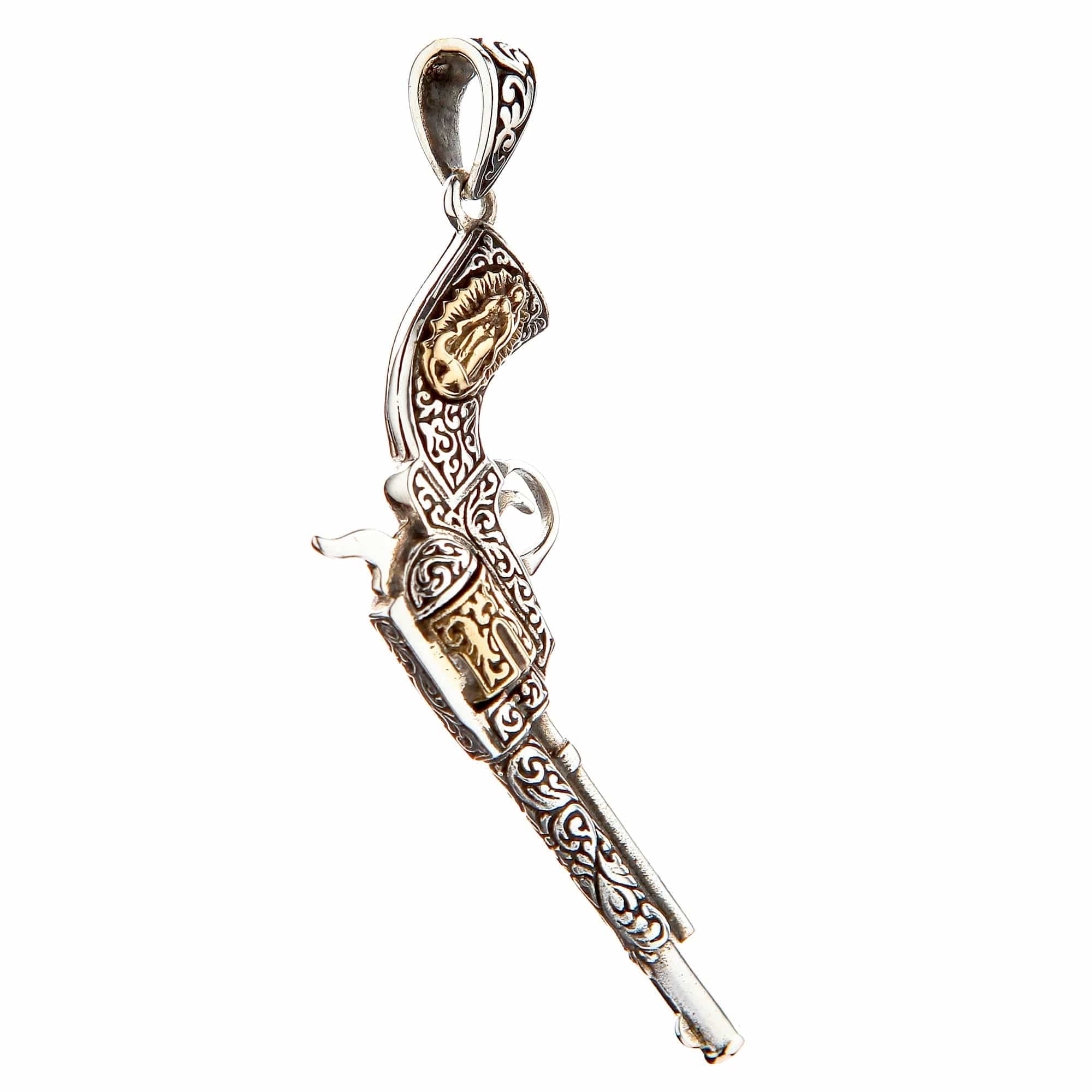 Capture the untamed spirit of the Old West with our incredibly detailed Mexican Gun Pendant. This is not just an accessory; it's a rugged statement piece that pays homage to the legendary firearms of gunslingers and outlaws. Expertly crafted in a stunning two-tone finish, this pendant is a symbol of freedom, rebellion, and classic Western charm.