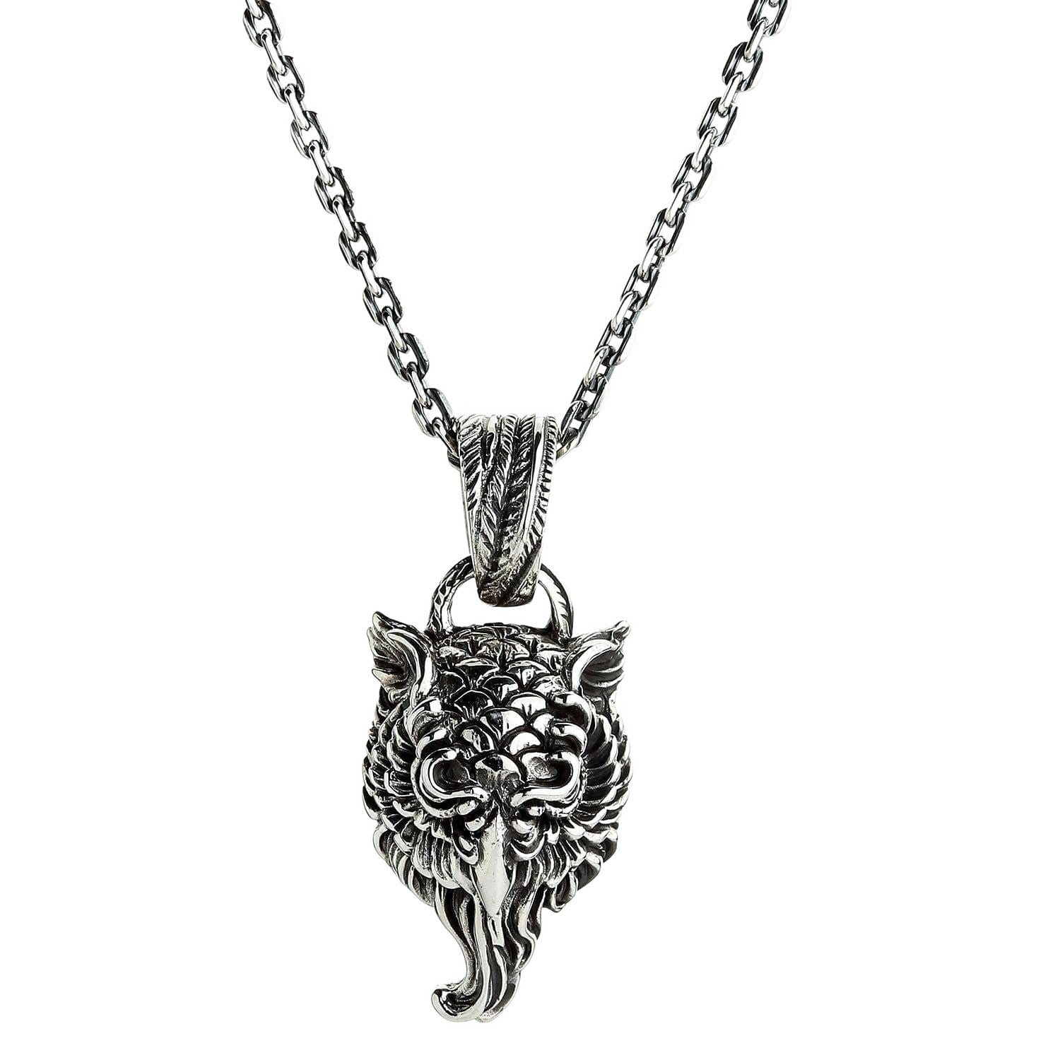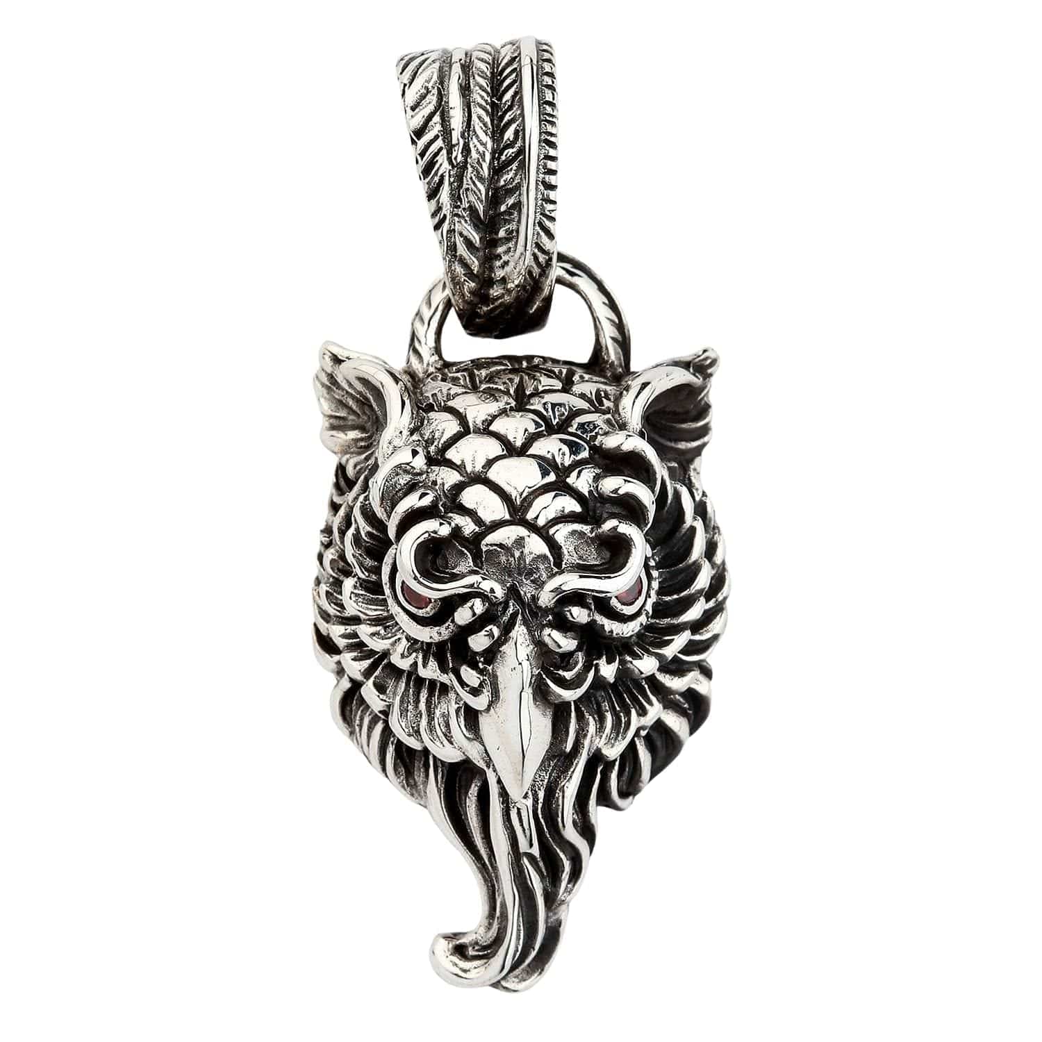 This pendant is a masterclass in texture and intensity. The entire piece is an exquisitely sculpted owl's head, its fierce and watchful expression captured with incredible detail. The surface is a tapestry of intricately carved feathers that continue up onto the ornate bail, with each plume defined by a dark, oxidized finish that creates a stunning, realistic sense of depth. Burning brightly from within the deep sockets are two brilliant, deep red Cubic Zirconia stones. These fiery eyes transform the wise owl into a symbol of passionate wisdom and supernatural power—an intelligence that is alive and formidable. Weighing a massive 21 grams, this piece of wearable art is as powerful as the creature it depicts.