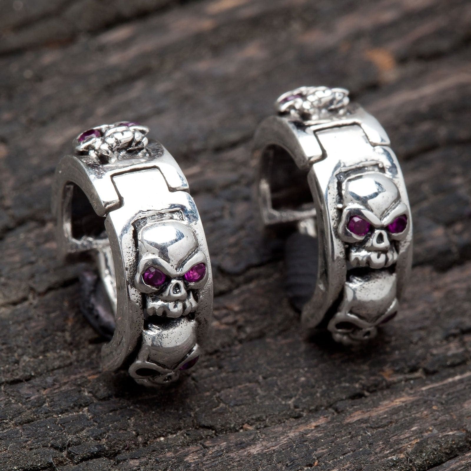 Pánské náušnice z ryzího stříbra s rubínovou lebkou