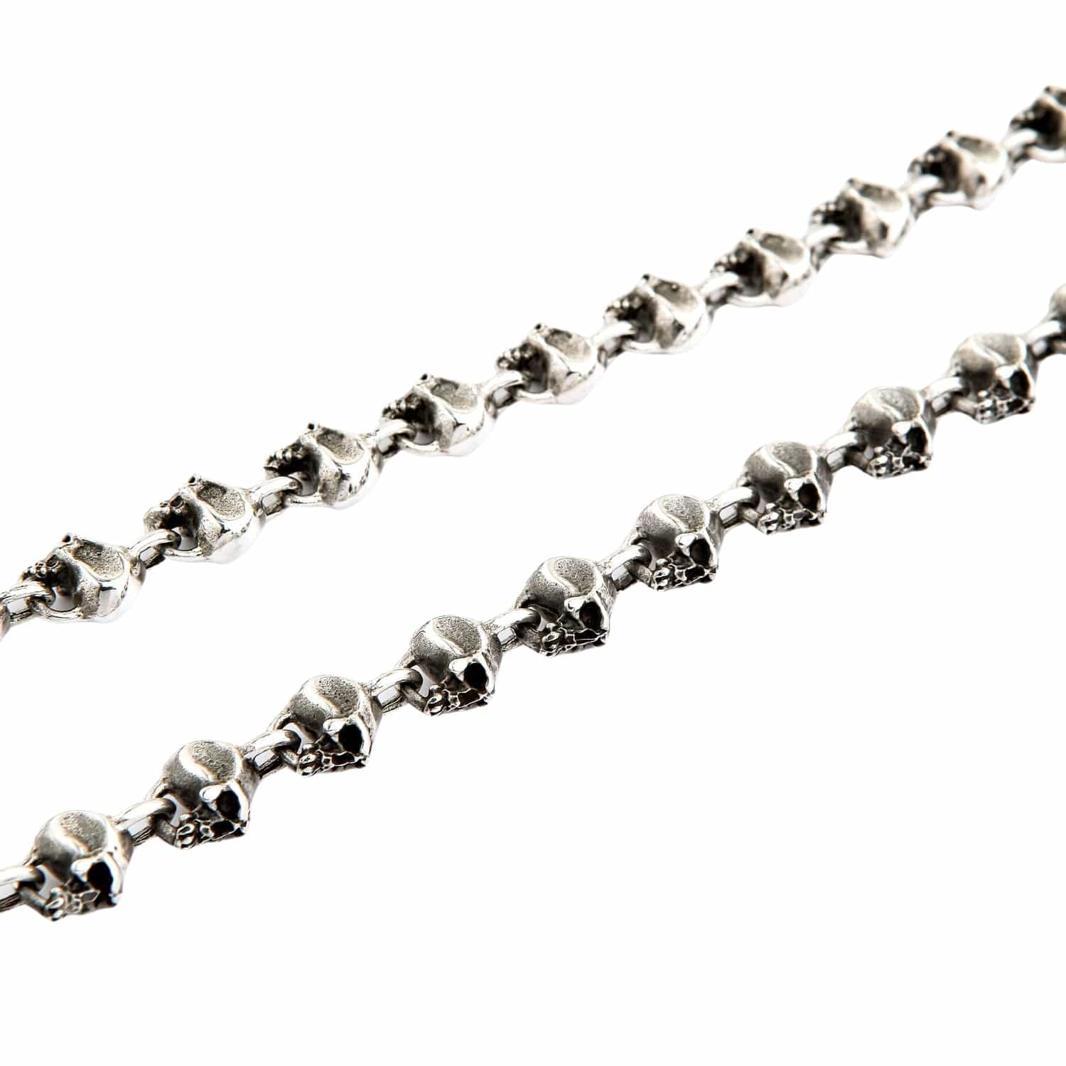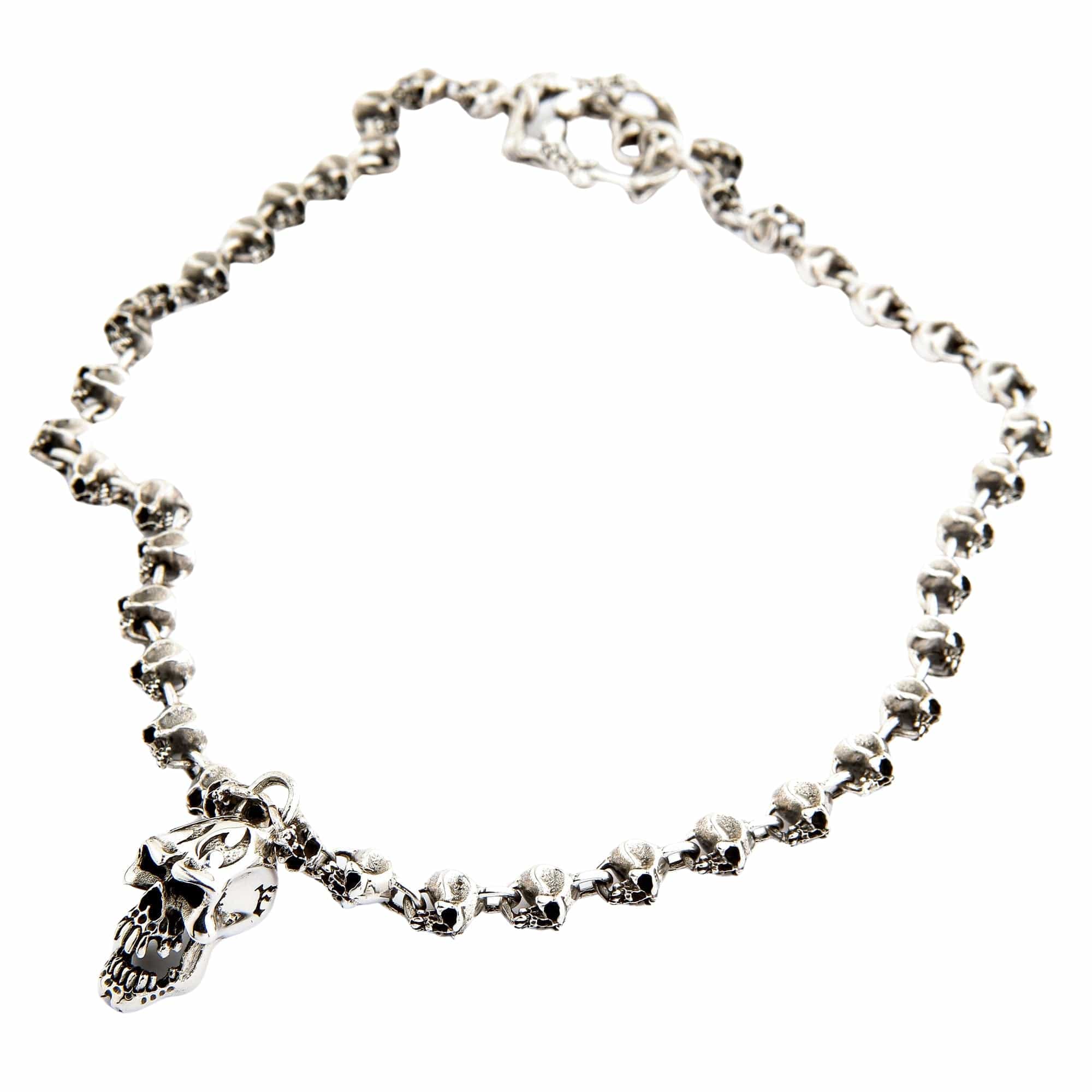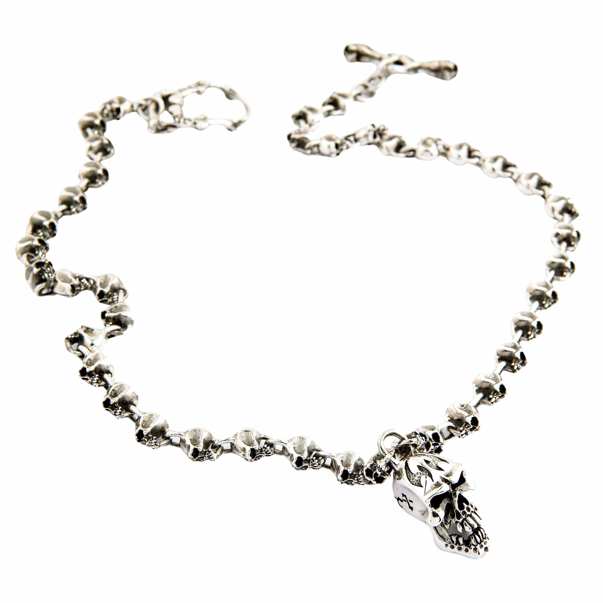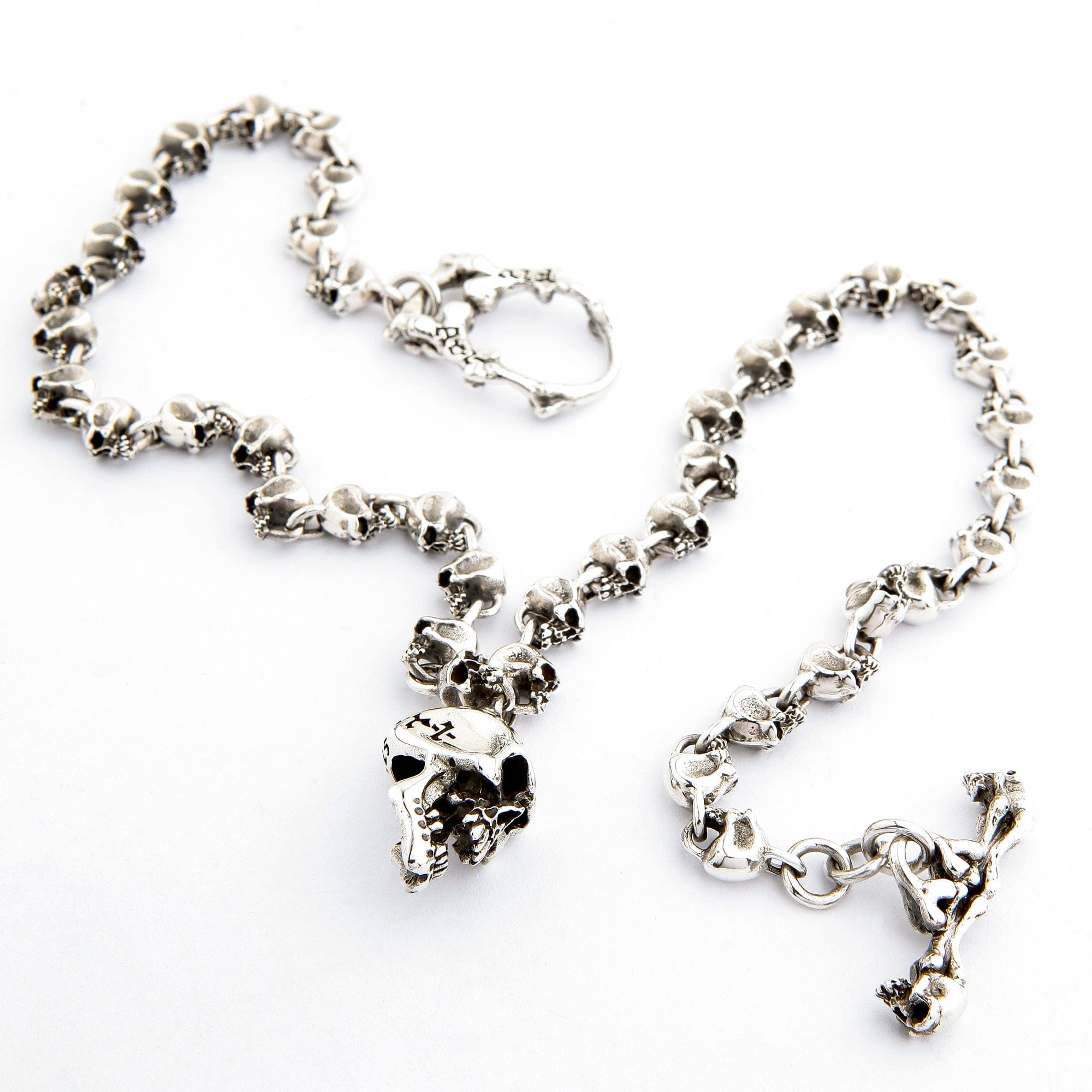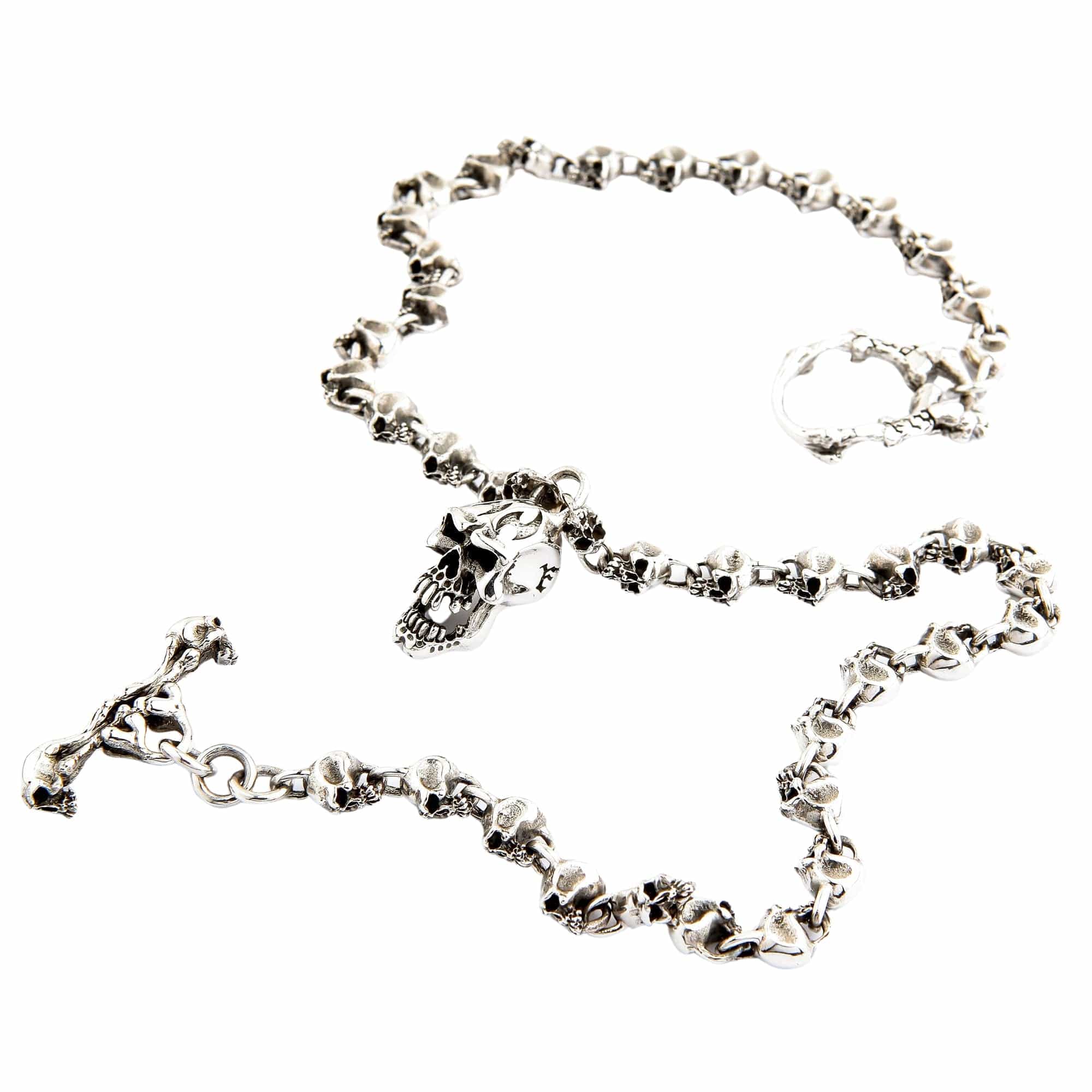 This incredible piece is crafted link by agonizing link, with each individual segment being a small, perfectly detailed skull. This continuous, unbroken chain of skulls creates a visceral, head-turning effect that is both intimidating and mesmerizing. The journey culminates in a large, formidable central skull pendant that serves as the necklace's fierce centerpiece. Even the custom T-bar clasp is a work of art, formed from bone and skull shapes, ensuring the powerful design is complete from every angle.