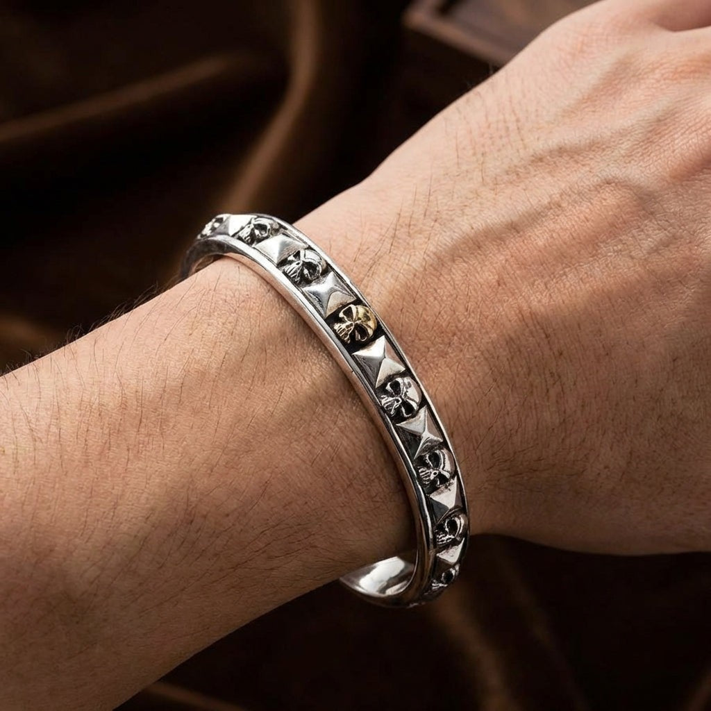 Stříbrný náramek s lebkou a motorkářskou manžetou