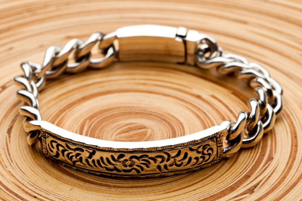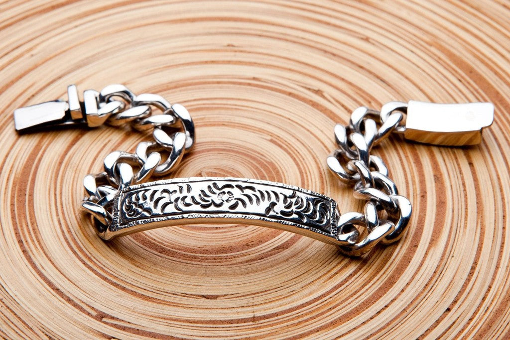 Představujeme pánský identifikační náramek Tribal Hammered ze stříbra 925 - odvážný kousek, který ztělesňuje sílu a styl. Tento mužský náramek, vyrobený ze 100% ryzího stříbra, má na lícové straně výrazný kmenový vzor, který z něj činí univerzální doplněk pro jakýkoli outfit.
