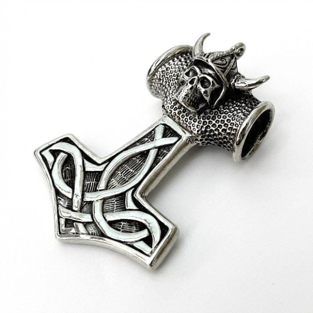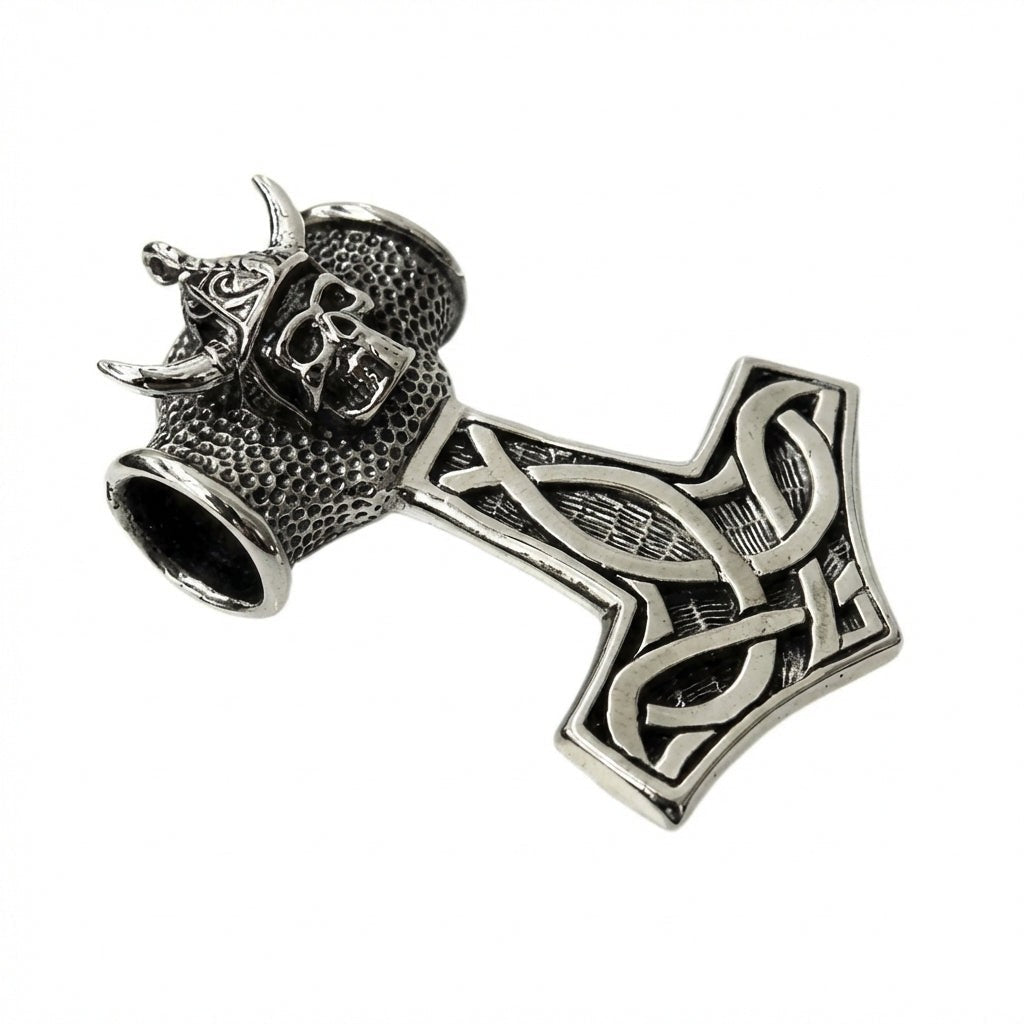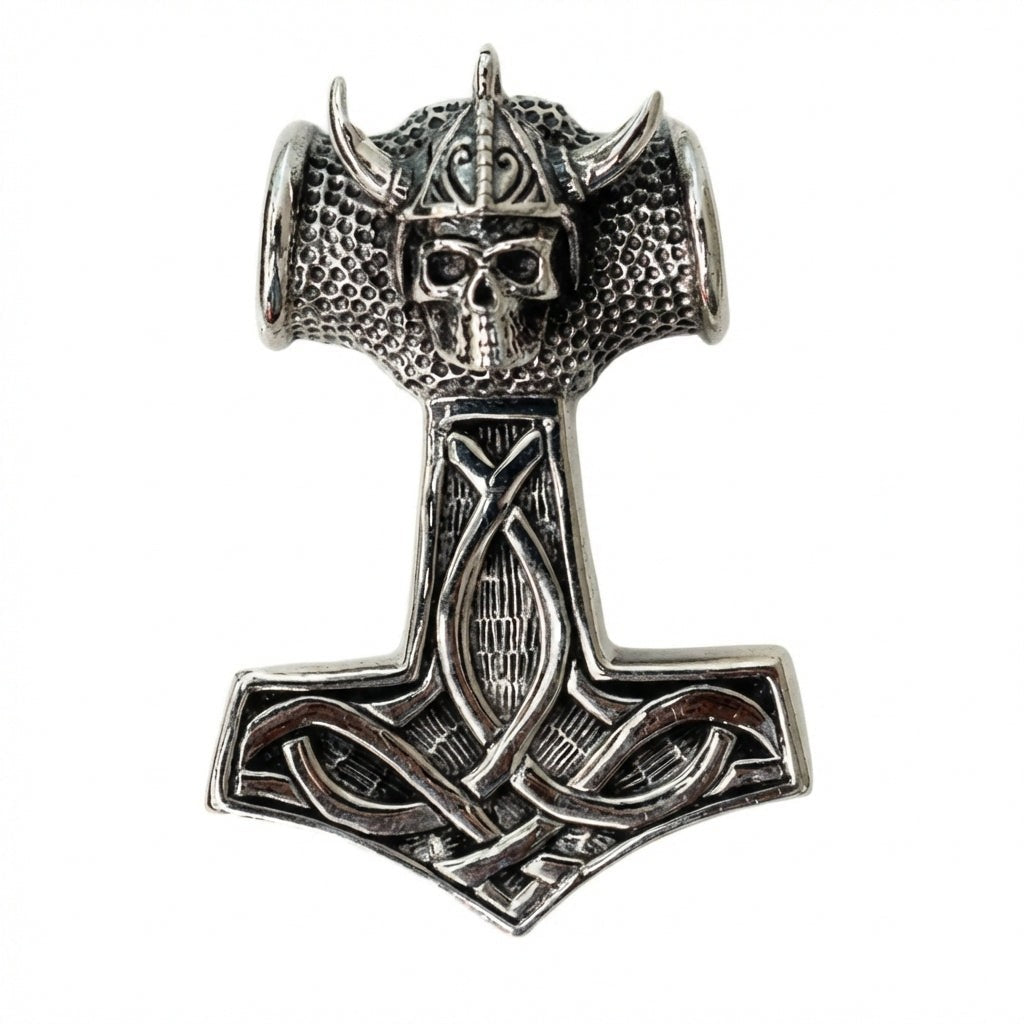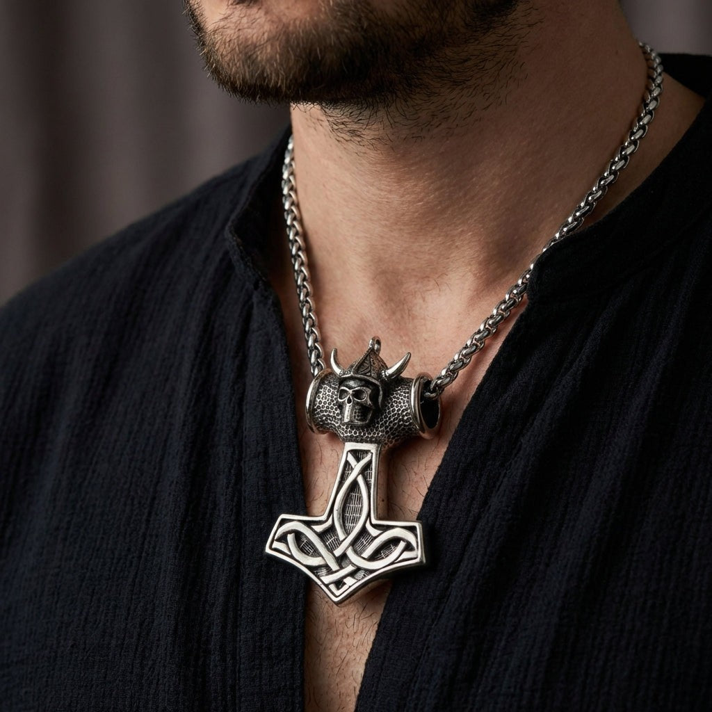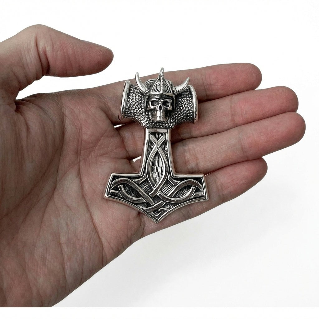 Nakupujte v našem obchoděTěžká vikingská lebka Thorovo kladivo 925 stříbrný přívěsek. Tento přívěsek je vyroben z prvotřídního ryzího stříbra 925 a ztělesňuje ducha vikingských válečníků a severské mytologie. Obsahuje nápadnou lebku na vrcholu Thorova ikonického kladiva.