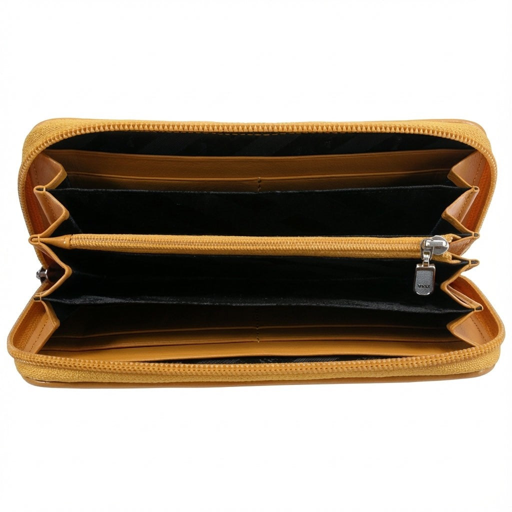Navrženo pro sofistikovanou organizaci, poskytuje dostatek úložného prostoru včetně 8 slotů na karty, 2 speciálních slotů na šekové knížky, slotu na pas, zipového oddílu a 2 prostorných slotů na bankovky. Díky své dvoubarevné žluté barvě kombinuje tato peněženka luxus s praktičností, což ji činí ideálním společníkem pro každodenní vyřizování i mezinárodní cesty.