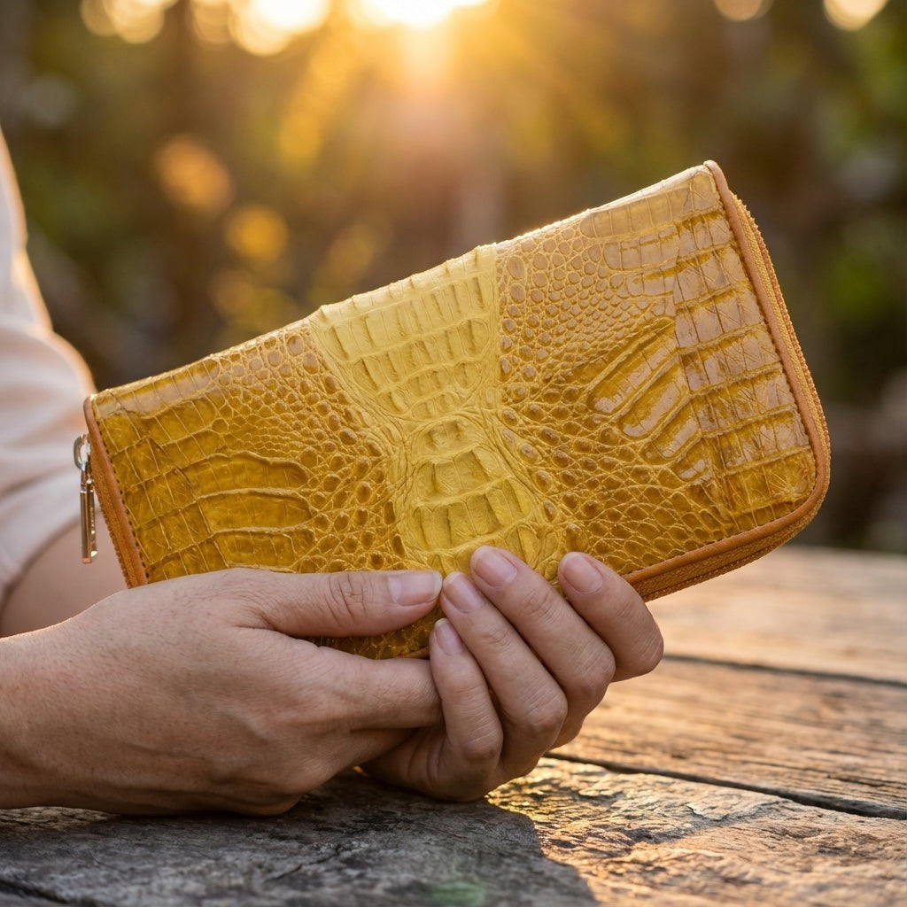 Přidejte do své kolekce živý nádech luxusu s naší žlutou dvoubarevnou krokodýlí koženou dámskou peněženkou. Vyrobeno zručnými řemeslníky z krokodýlí kůže, tento stylový doplněk zaručuje dlouhotrvající eleganci a funkčnost.