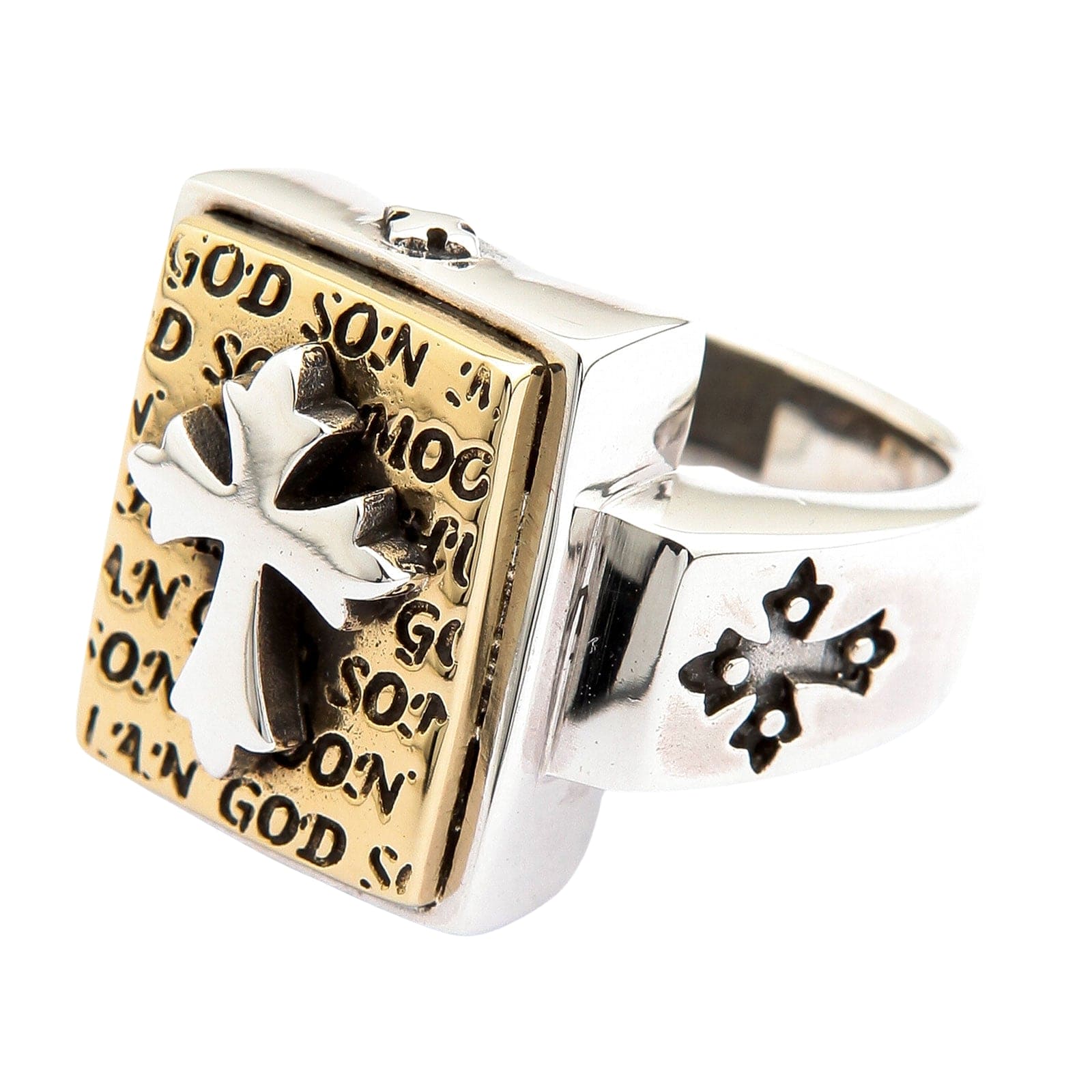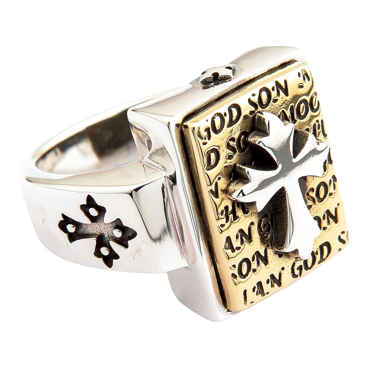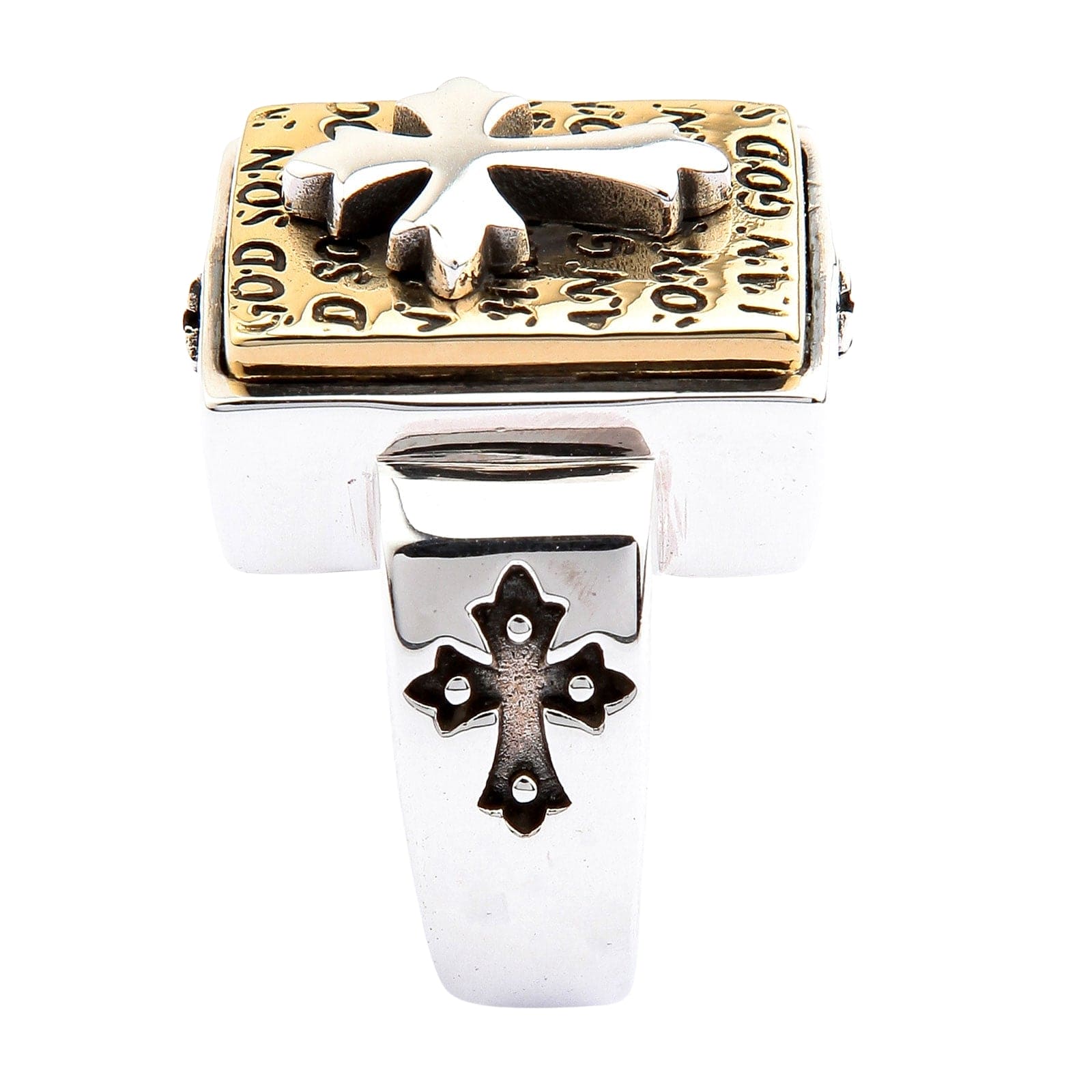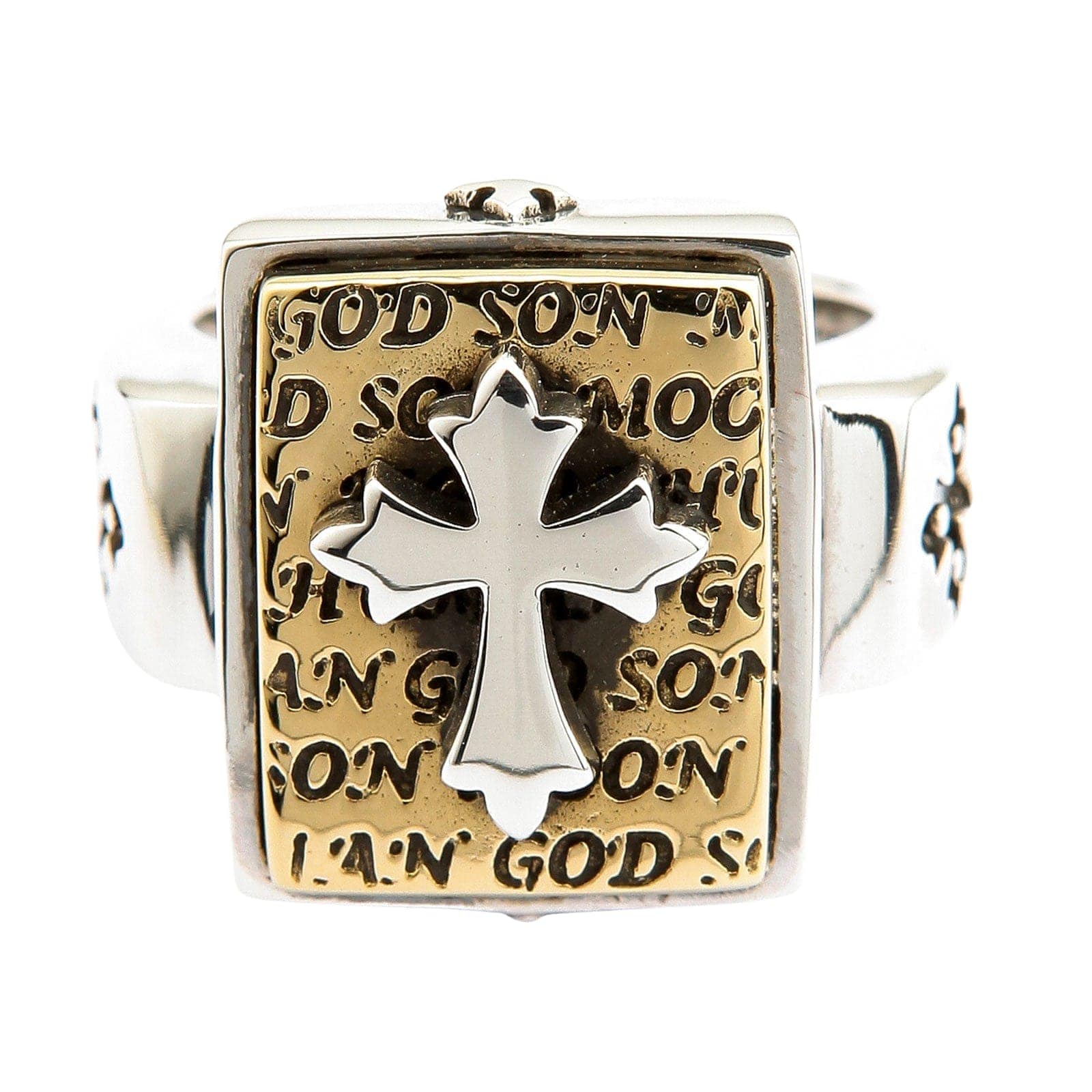 Denne ring er et dybt stykke bærbar teologi, fyldt med betydning. Den store, signetrings-inspirerede front er designet som en miniatureudgave af Bibelen, med en rigt guldbelagt messingflade sirligt indgraveret med de hellige ord "GOD SON". Dette repræsenterer Guds Ord som grundlaget for al tro. Ud af denne hellige tekst rejser sig i imponerende 3D et markant, poleret kors i sterlingsølv—det ultimative symbol på Kristi offer og frelse.