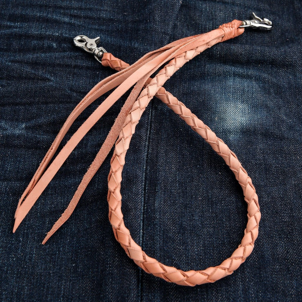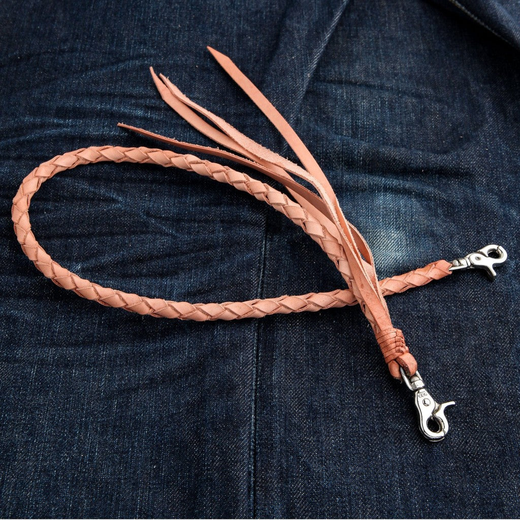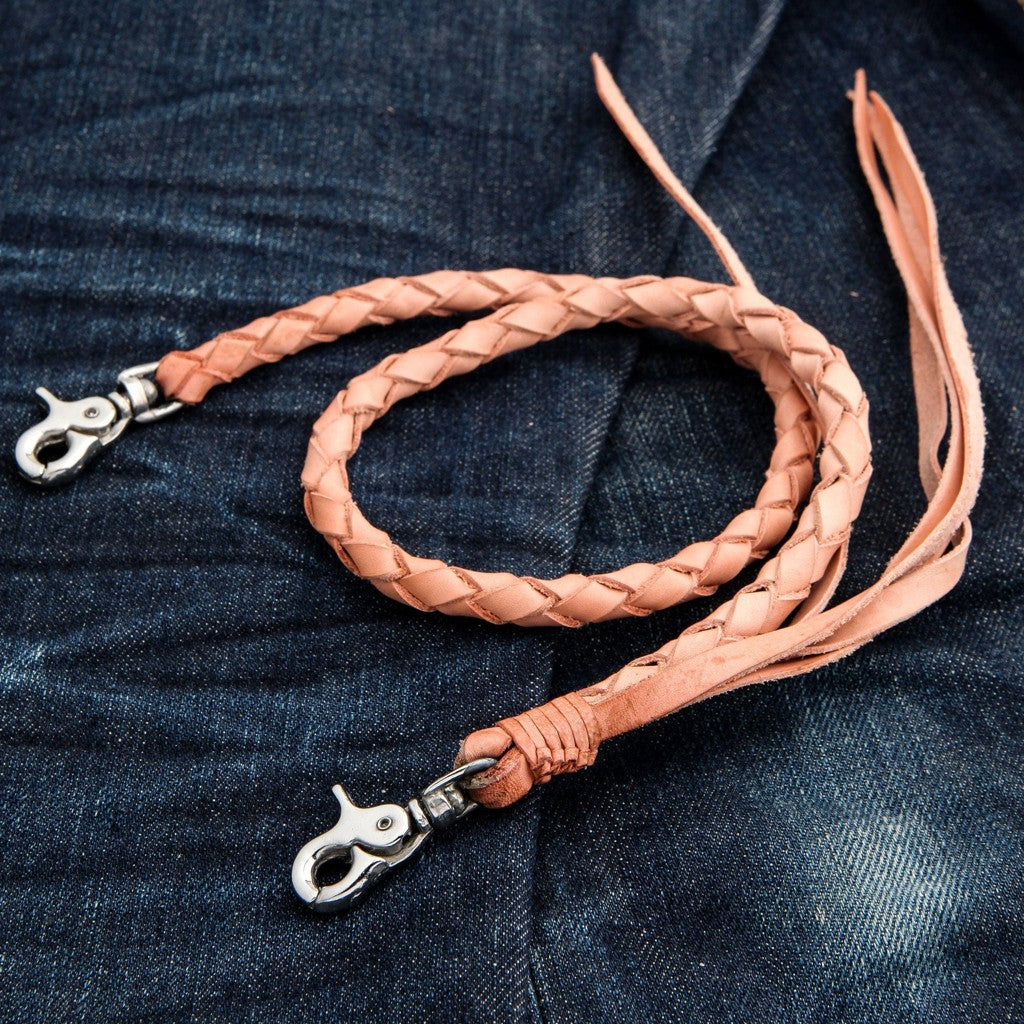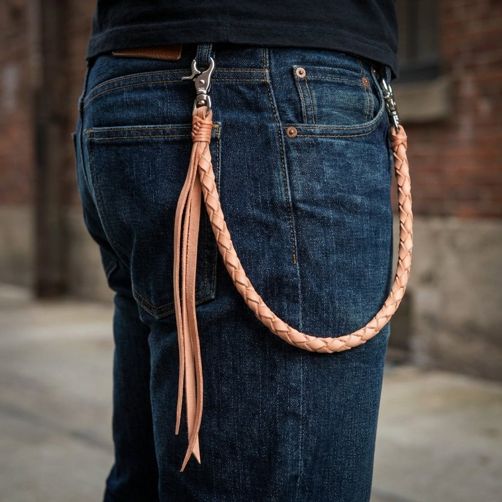 Tag et skridt væk fra traditionelle bikerfarver med vores iøjnefaldende Light Tan Braided Genuine Cowhide Leather Wallet Chain. Denne håndlavede tegnebogskæde kombinerer originalitet med daglig funktionalitet og tilføjer et subtilt, men stilfuldt præg til din samling af biker-tilbehør.