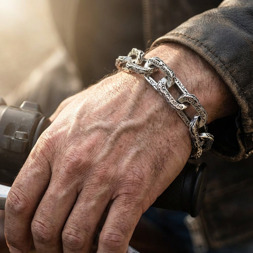 Vi mener, at et armbånd, der repræsenterer en dragons kraft, skal være støbt i et materiale, der matcher dens intensitet. Hele smykket, fra det første led til den sidste detalje på dragehovedlåsen, er støbt i 100% massivt .925 sterling sølv. Der er ingen hule dele, ingen smutveje. Denne dedikation til rent, højkvalitets sølv giver armbåndet dets flotte polering, utrolige vægt og styrken til at modstå et helt livs slid.