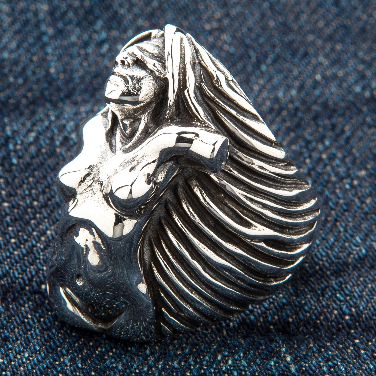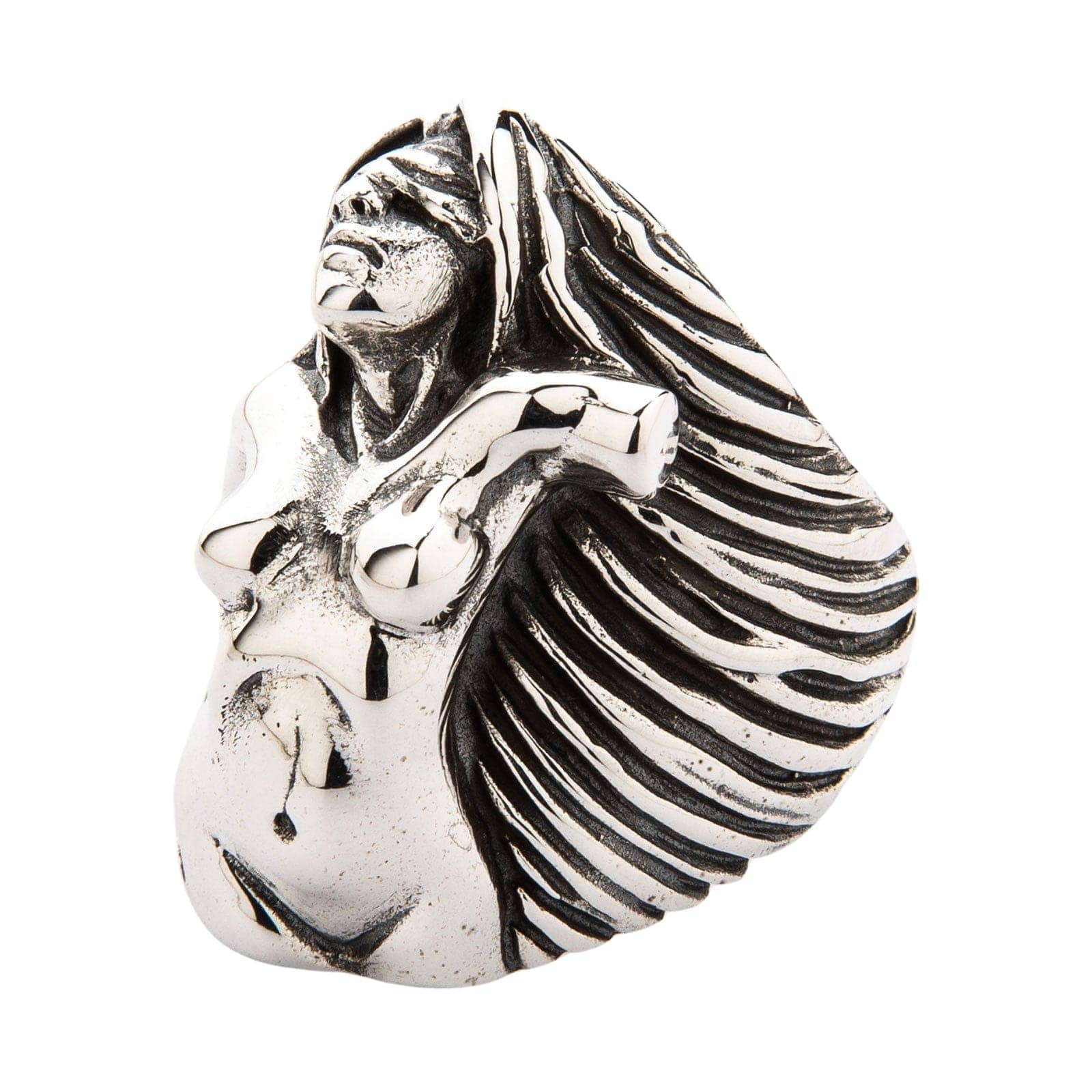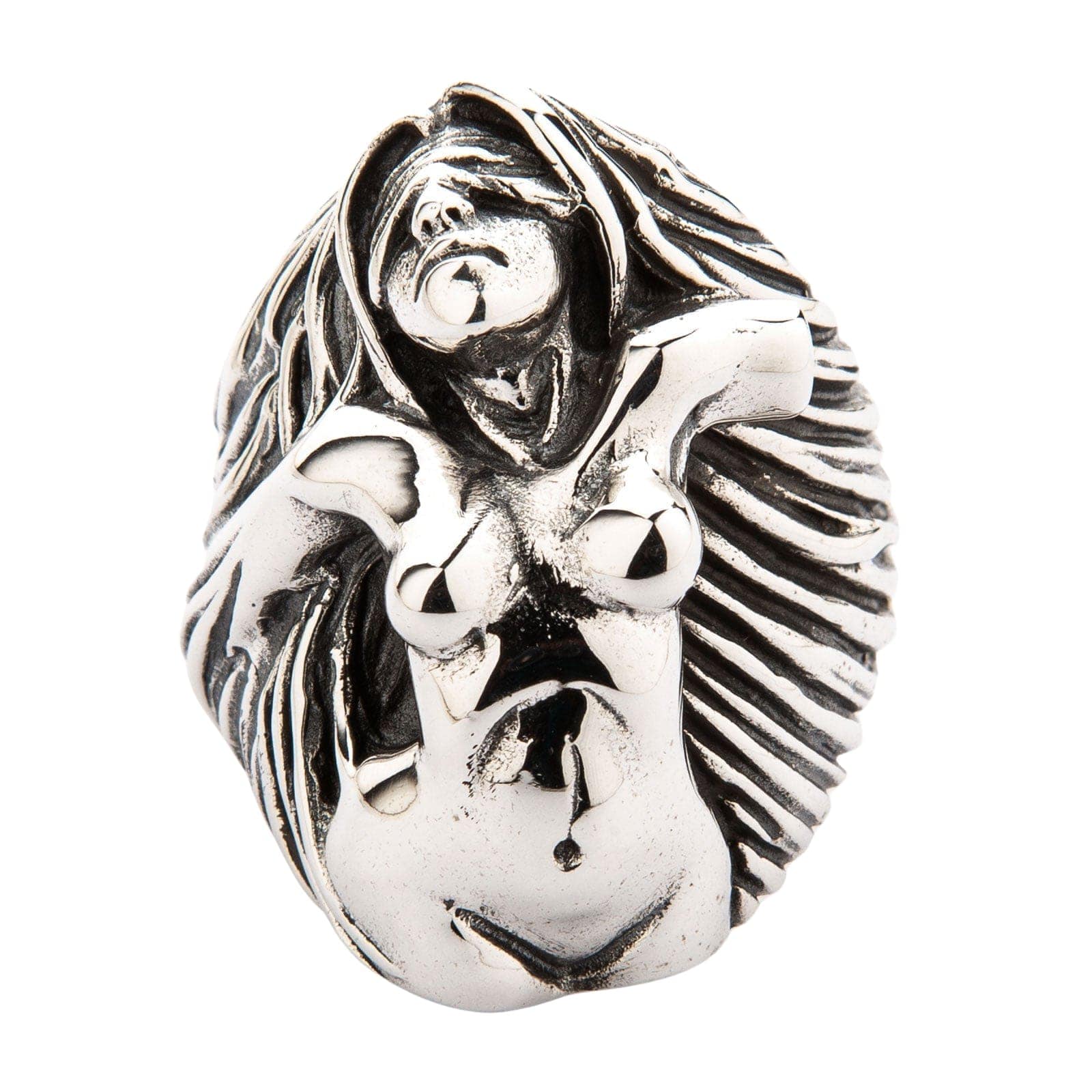 En markant og kompromisløs hyldest til kvindelig skønhed og kunstnerisk udtryk – denne fortryllende nøgen dame-ring er en ægte bærbar skulptur. Smedet af et massivt stykke sterlingsølv fanger denne ring en mystisk og kraftfuld kvindefigur i udsøgt, højt-relief. Det er mere end blot en ring; det er en hyldest til klassisk kunst og menneskekroppens tidløse skønhed.