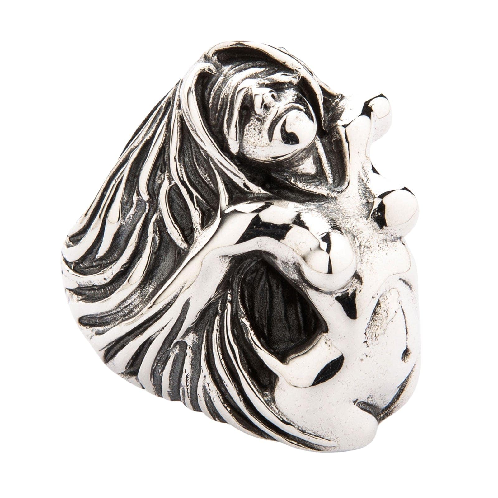 Denne ring er et mesterværk i mørk romantik. En kraftfuld kvindefigur er skulptureret i imponerende detalje, hendes hoved let bagover i et øjeblik af passion, styrke eller stille eftertænksomhed. Hendes øjne er skjult bag hendes eget lange, bølgende hår, hvilket skaber en aura af dyb mystik og antyder en dyb, ukendt indre verden. Håret flyder ud og danner den teksturerede, vinge-lignende baggrund for hele smykket, der omfavner hende i en beskyttende og organisk kokon.