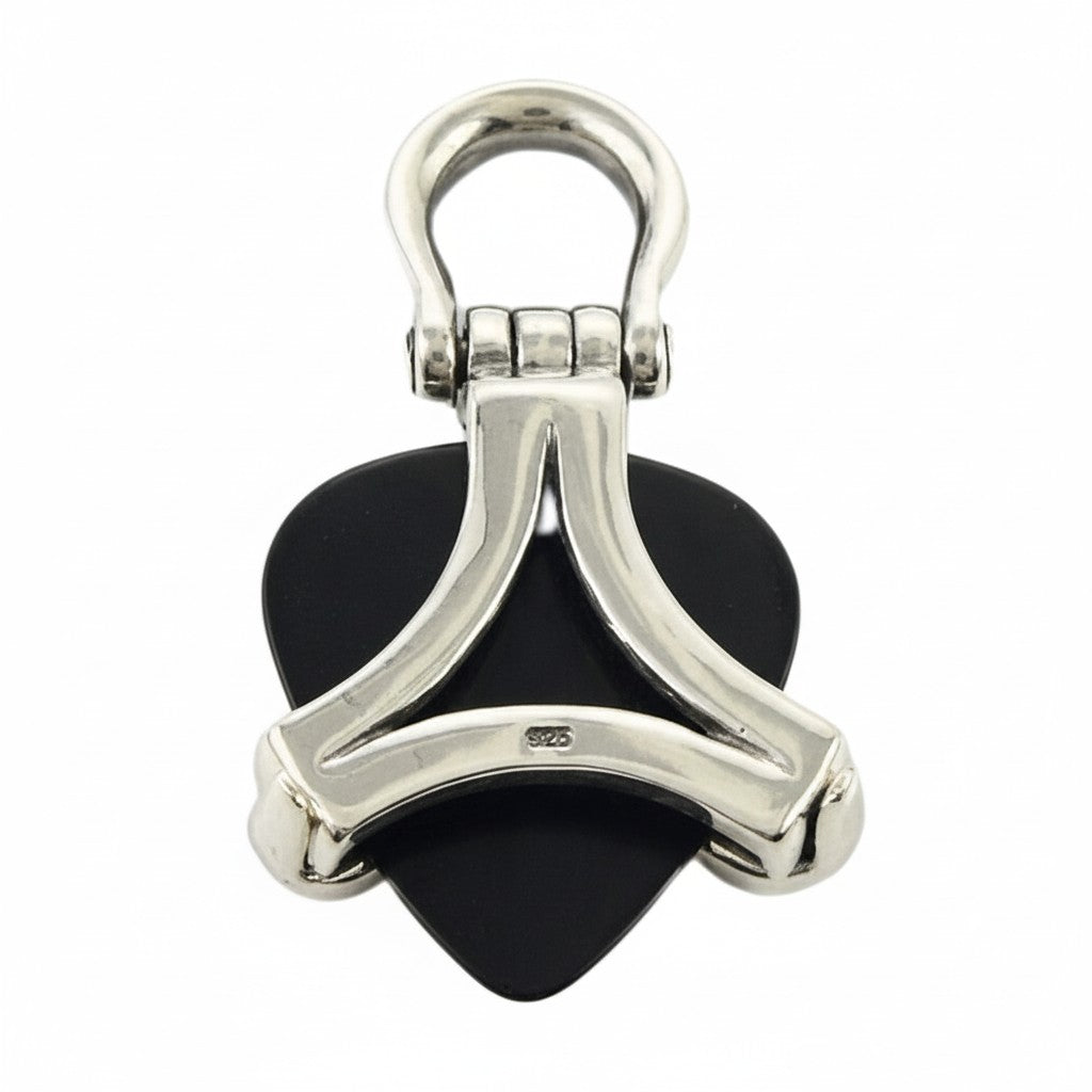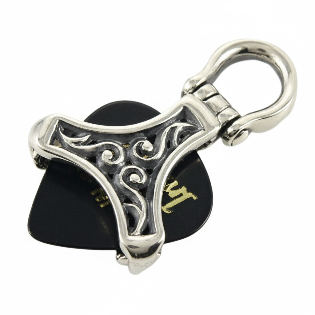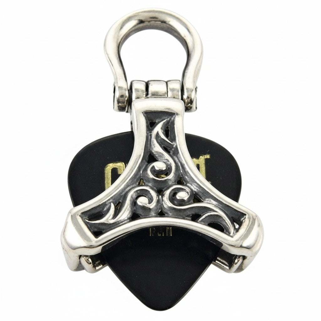 Genistregen ved dette vedhæng er dets smarte, funktionelle design. Det er et medaljon-lignende bur, med hængsel, så det kan åbnes og sikkert rumme et standard guitarplekter, så du aldrig mangler dit vigtigste værktøj. Men det er langt fra en simpel beholder. Hele sterlingsølvrammen er en lærred af indviklede, snoede stamme-mønstre, der minder om gamle keltiske knudemotiver. Dette kraftfulde, åbne design får liv med en mørk, oxideret finish, der skaber en slående kontrast til det blankpolerede sølv. Det er en bærbar fortælling om et liv dedikeret til musikken—et stærkt statement for guitaristen, der altid er klar til at spille.
