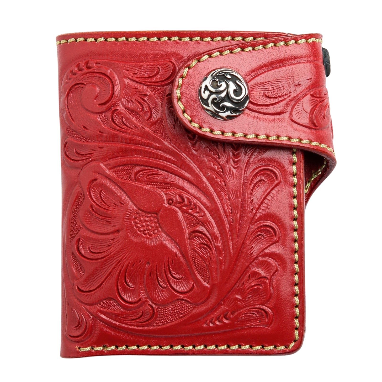 Das Erste, was Ihnen auffällt, ist das atemberaubende, tiefrote Finish – ein satter Farbton, der alle Blicke auf sich zieht. Doch die wahre Schönheit liegt im Detail. Unsere erfahrenen Handwerker schnitzen in mühevoller Handarbeit ein kompliziertes Blumenmuster über die gesamte Oberfläche. Diese traditionelle Lederbearbeitungstechnik verleiht der Brieftasche eine dynamische, fast von Tätowierungen inspirierte Textur, die sich genauso unglaublich anfühlt wie sie aussieht. So gleicht keine zwei Brieftaschen genau der anderen.