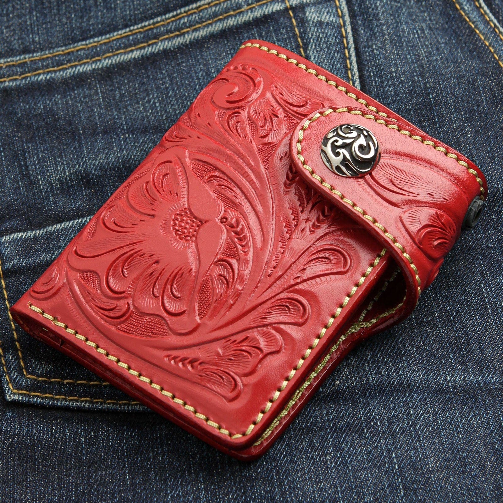 Heben Sie sich mit unserer leuchtend roten Biker-Geldbörse aus Leder von der Masse ab – ein Meisterwerk handwerklicher Kunstfertigkeit und robuster Funktionalität. Dies ist kein gewöhnliches Portemonnaie; es ist ein auffälliges Statement-Stück , sorgfältig aus echtem Rindsleder gefertigt und für alle gedacht, die sowohl herausragenden Stil als auch Langlebigkeit auf der Straße schätzen. Die satte Farbe und die aufwendigen Schnitzereien machen sie zu einem sofortigen Klassiker.