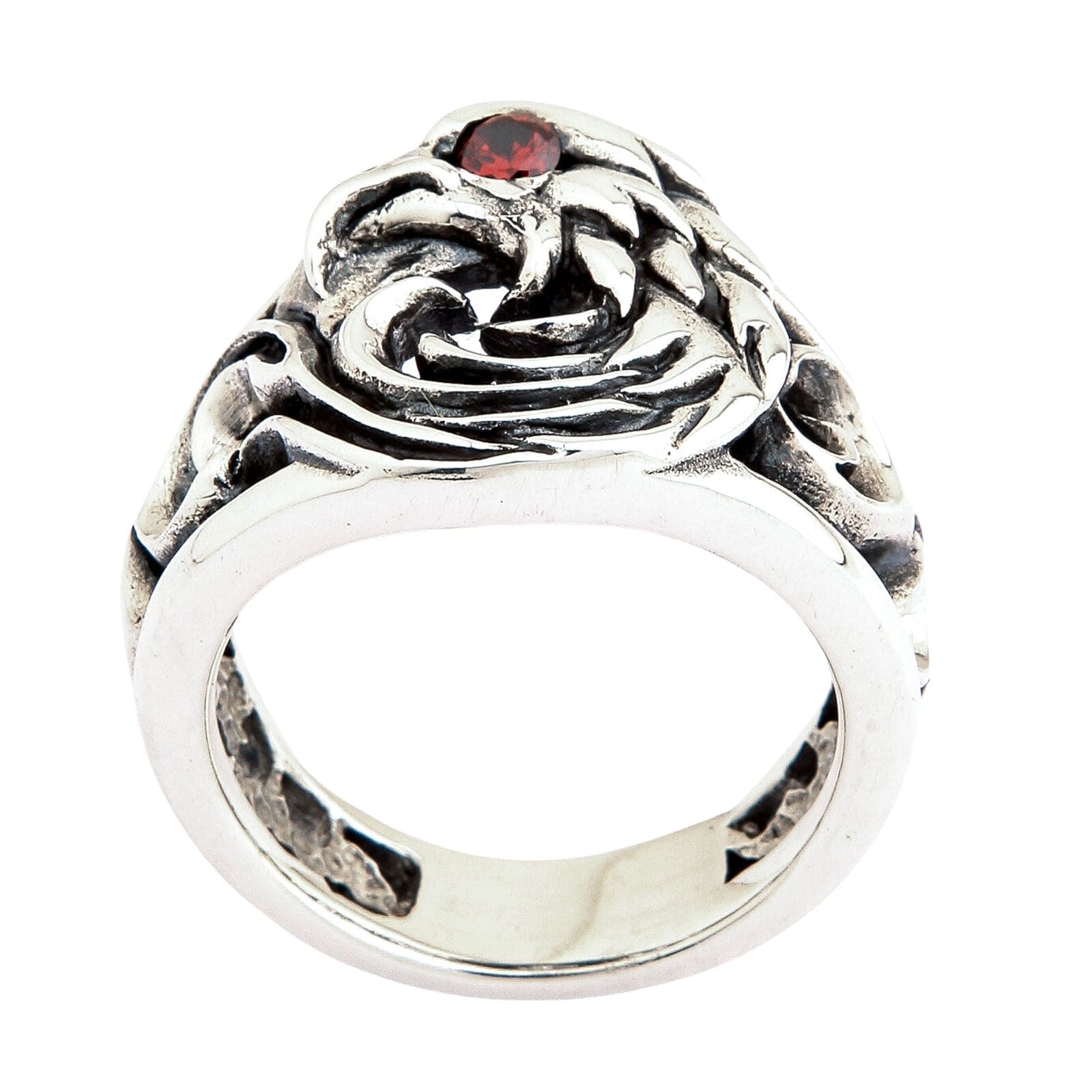 Dieser Ring interpretiert den klassischen Adler meisterhaft mit einer dunklen und kraftvollen gotischen Note. Der legendäre Greifvogel scheint aus einem Strom fließender, flammenartiger Wirbel geformt zu sein, was ihm eine dynamische und fast übernatürliche Anmutung verleiht, die an einen mythischen Feuervogel oder Phönix erinnert. Sein einzelnes, durchdringend rotes Auge, ein brillanter Zirkonia-Stein, glüht in intensivem Feuer und symbolisiert die unnachgiebige Konzentration eines Kriegers und seine unbändige, brennende Leidenschaft.