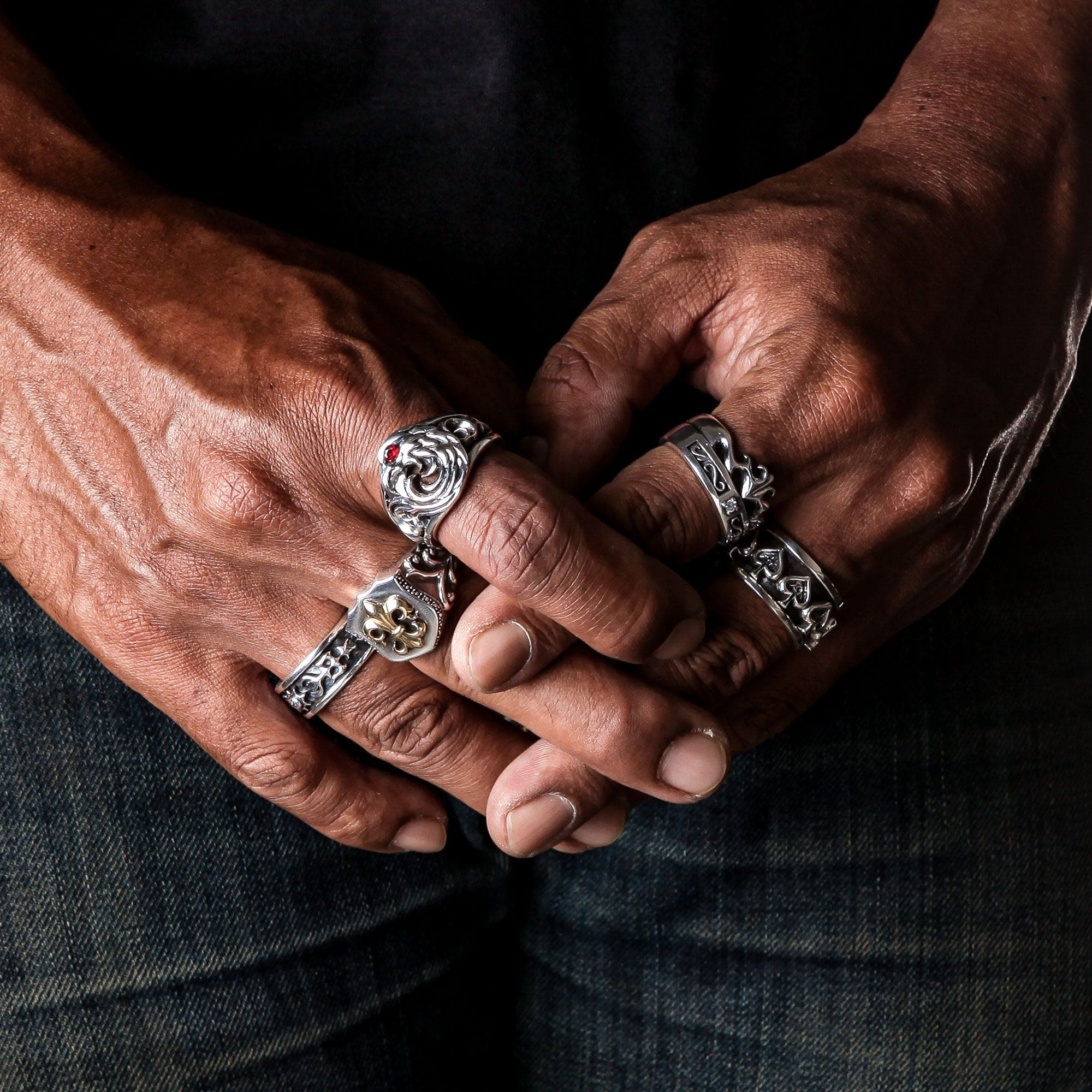 Dieser Tribal-Adlerring ist ein einzigartiges tragbares Kunstwerk für alle, die sowohl im Tier als auch in der Flamme Kraft sehen. Als herausragendes Stück Gothic-Schmuck und Paradebeispiel für modernen Bikerschmuck ist dieser Ring mit dem rotäugigen Adler für ein Leben voller Leidenschaft und Kraft geschaffen.