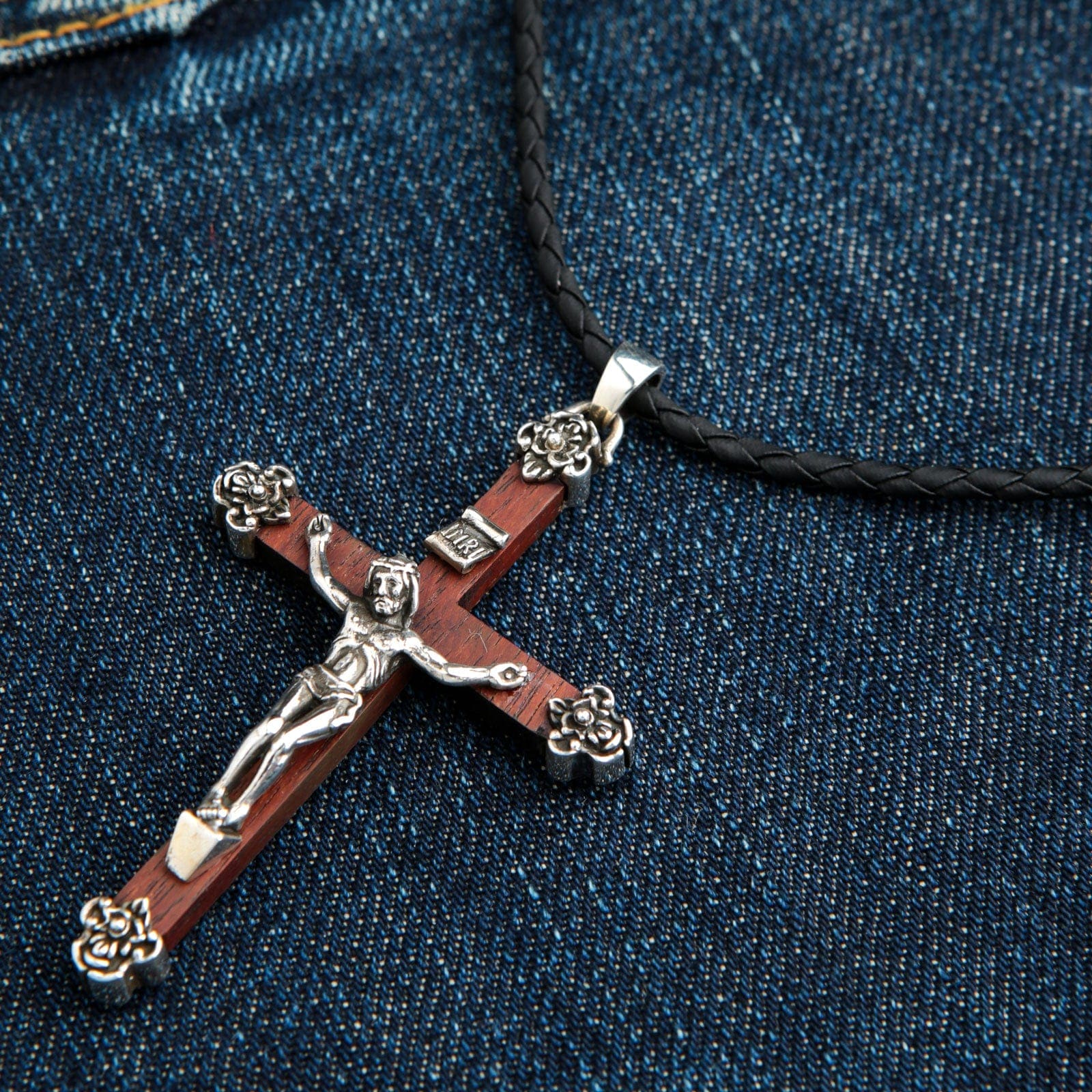 Dieses Design ist reich an Symbolik und besticht durch wunderschöne Kontraste. Das Kreuz selbst ist aus edlem, echtem braunem Holz gefertigt – eine bedeutungsvolle Anspielung auf das schlichte, natürliche Material des Wahren Kreuzes. Darauf ruhen die detailreiche Figur Jesu, die INRI-Schriftrolle und die kunstvollen, floralen Endkappen, alle aus glänzendem Sterlingsilber gegossen.